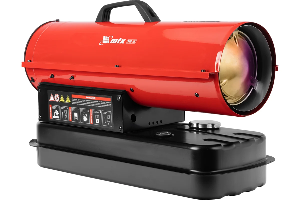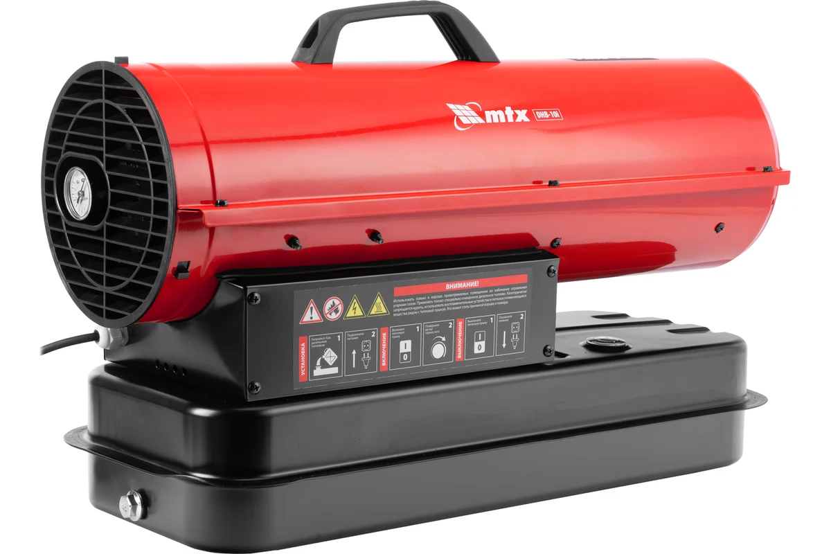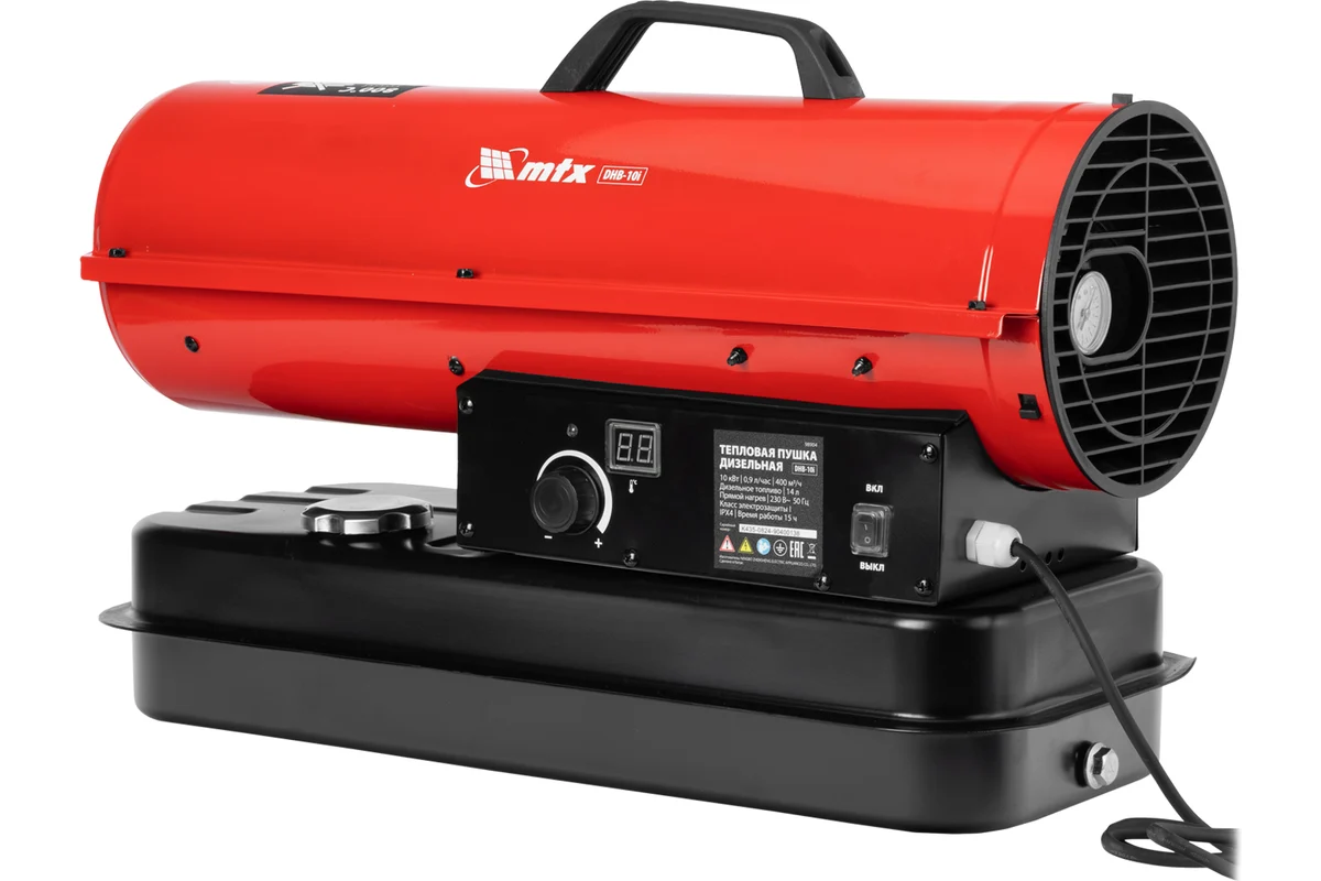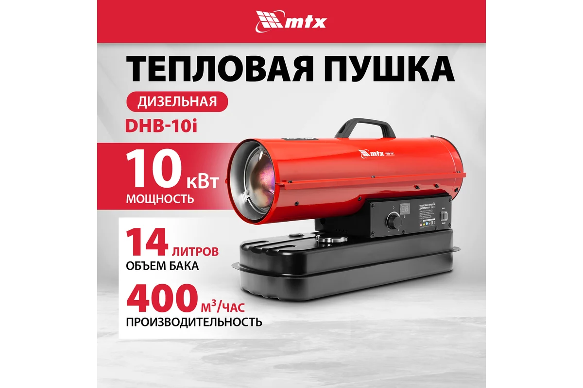 Дизельная тепловая пушка MTX DHB-10i, нагрев прямой, мощность 10 кВт, площадь обогрева 100 м2, объем бака 14 л, расход воздуха 400 м³/ч