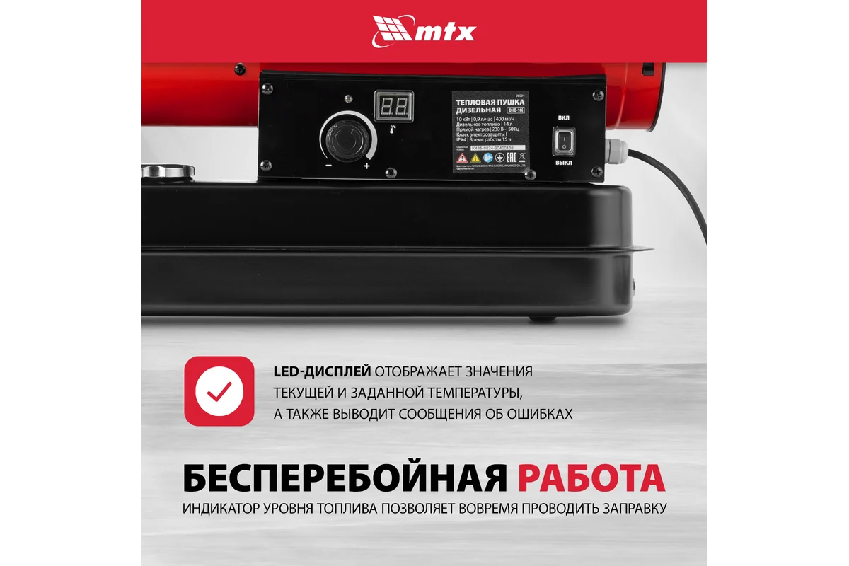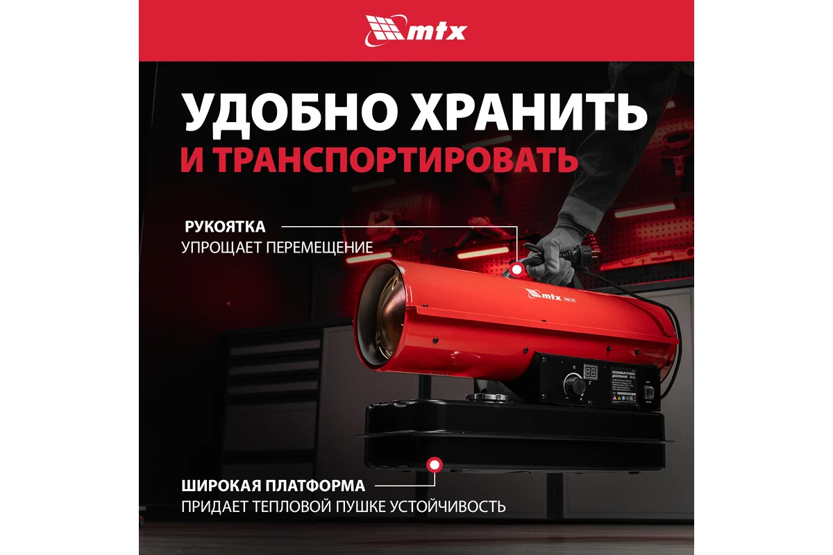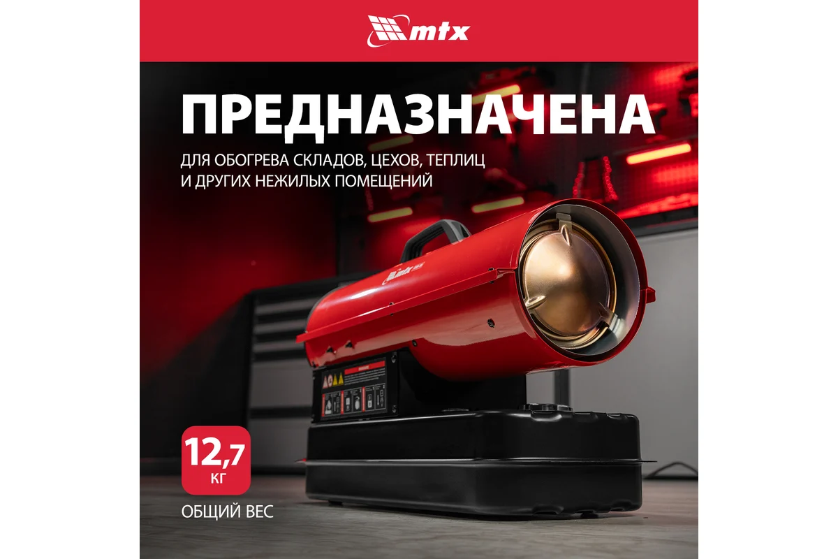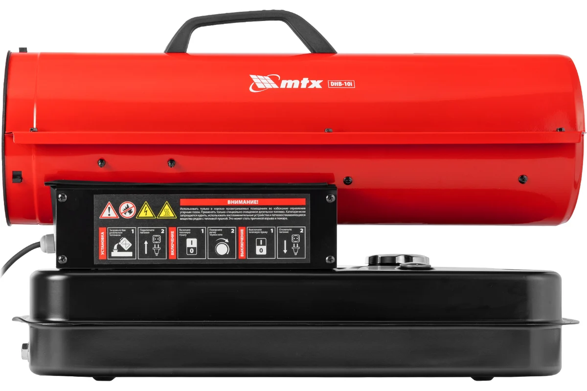 Дизельная тепловая пушка MTX DHB-10i, нагрев прямой, мощность 10 кВт, площадь обогрева 100 м2, объем бака 14 л, расход воздуха 400 м³/ч