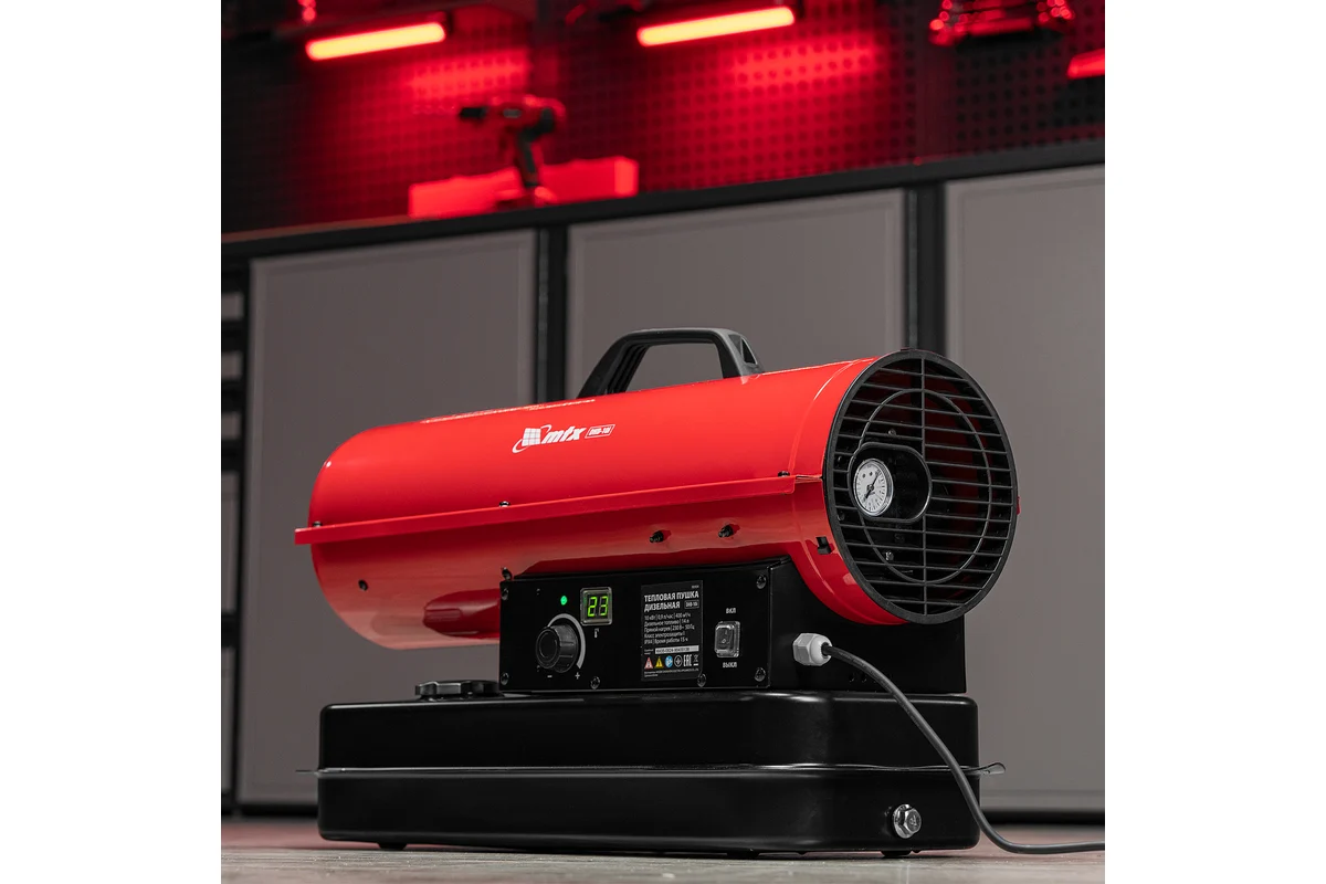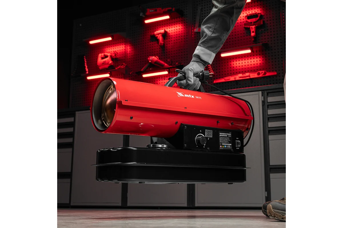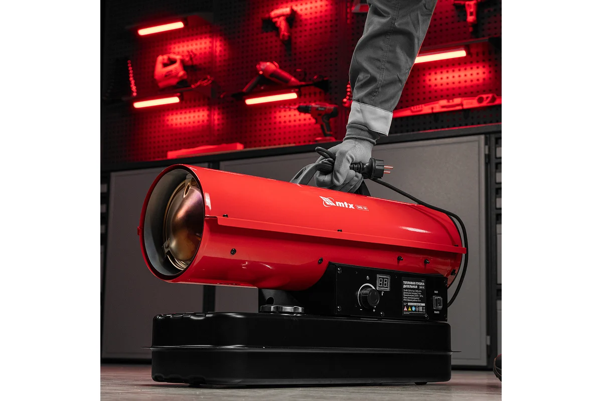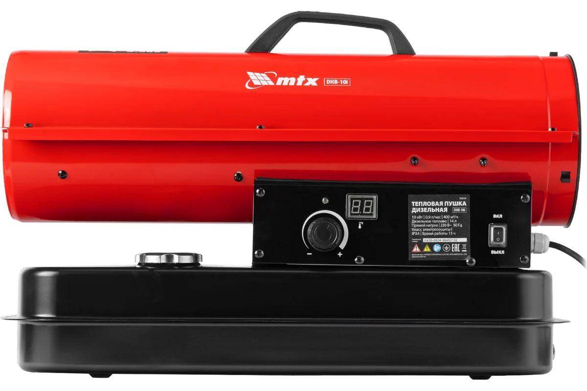 Дизельная тепловая пушка MTX DHB-10i тепловой мощностью 10 кВт и производительностью 400 м3/ч, с прямым типом нагрева и термостатом, предназначена для обогрева складов, цехов, теплиц и других нежилых помещений. Также используется на производстве и в строительстве: для прогрева бетона, просушки стен и разморозки траншей. Важно: в обогреваемом помещении необходимо обеспечить хорошую вентиляцию!
