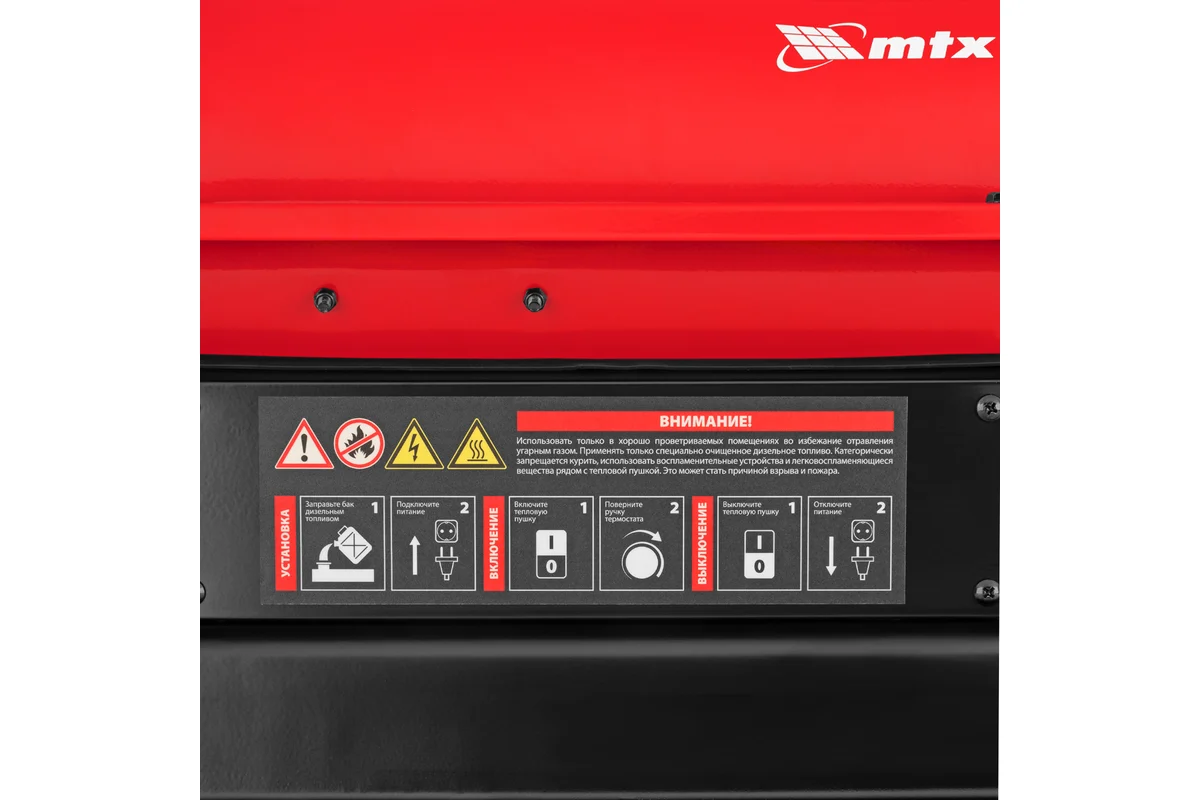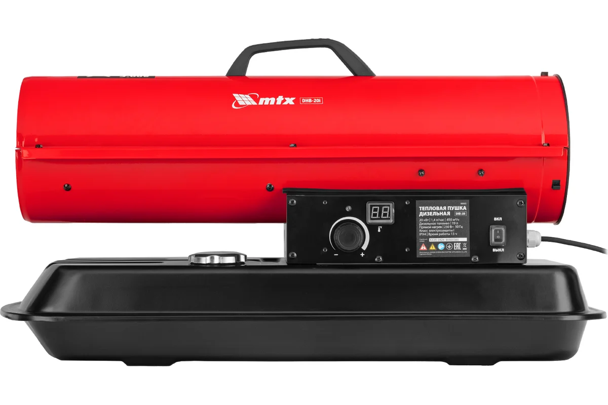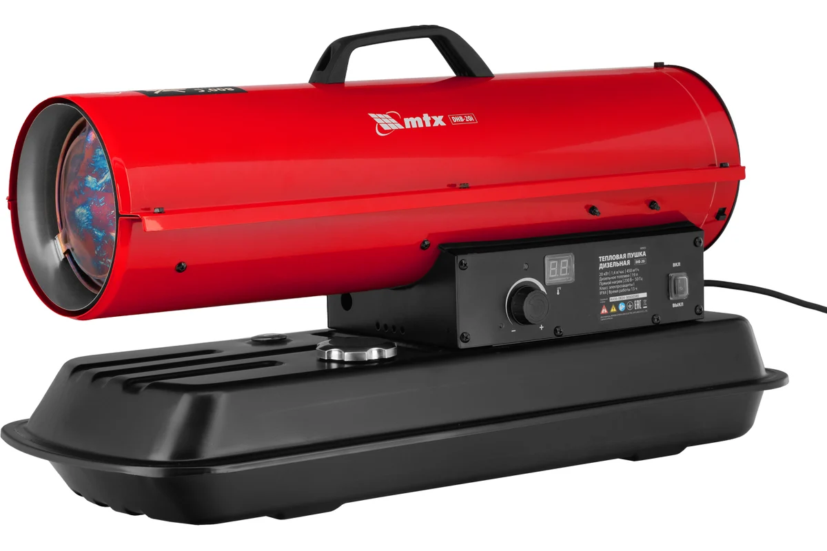 Дизельная тепловая пушка MTX DHB-20i тепловой мощностью 20 кВт и производительностью 450 м3/ч, с прямым типом нагрева и термостатом, предназначена для обогрева складов, цехов, теплиц и других нежилых помещений. Также используется на производстве и в строительстве: для прогрева бетона, просушки стен и разморозки траншей. Важно: в обогреваемом помещении необходимо обеспечить хорошую вентиляцию!