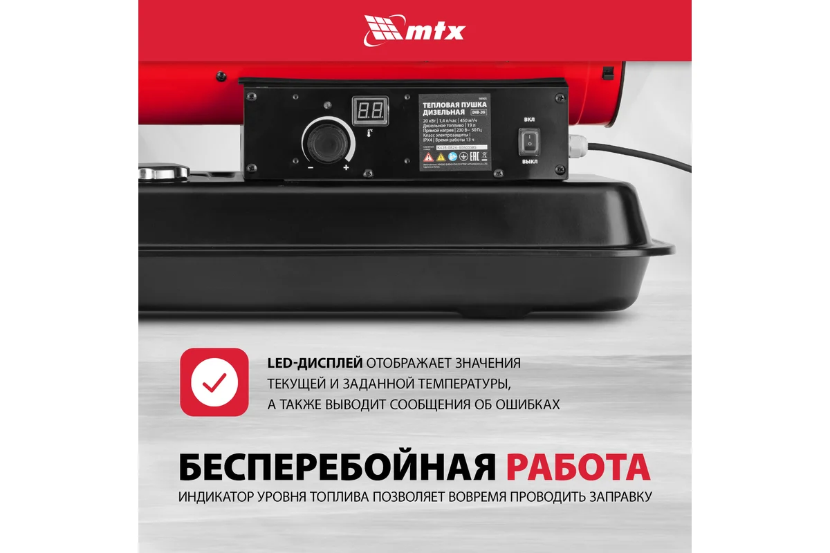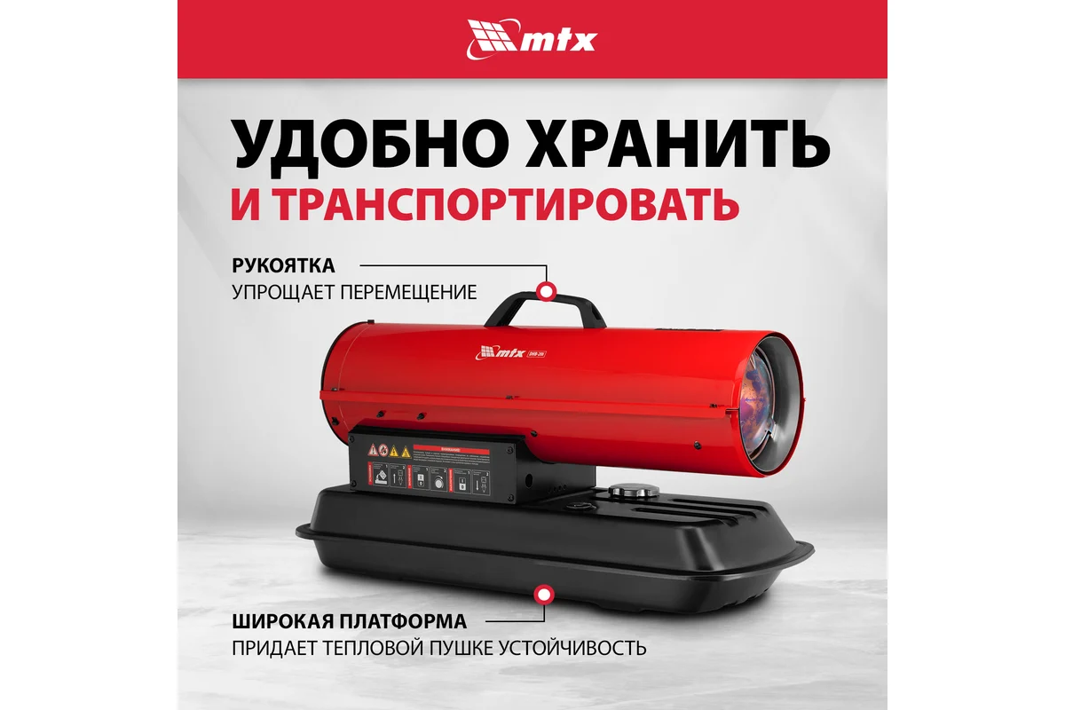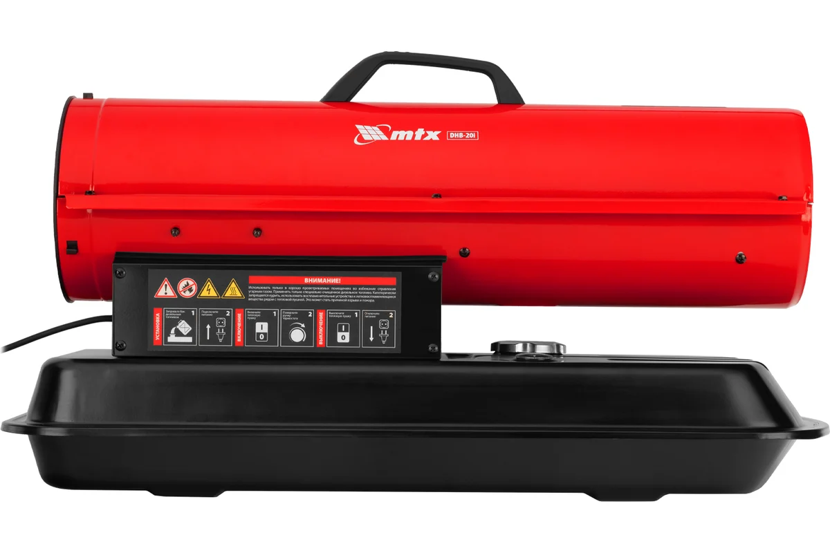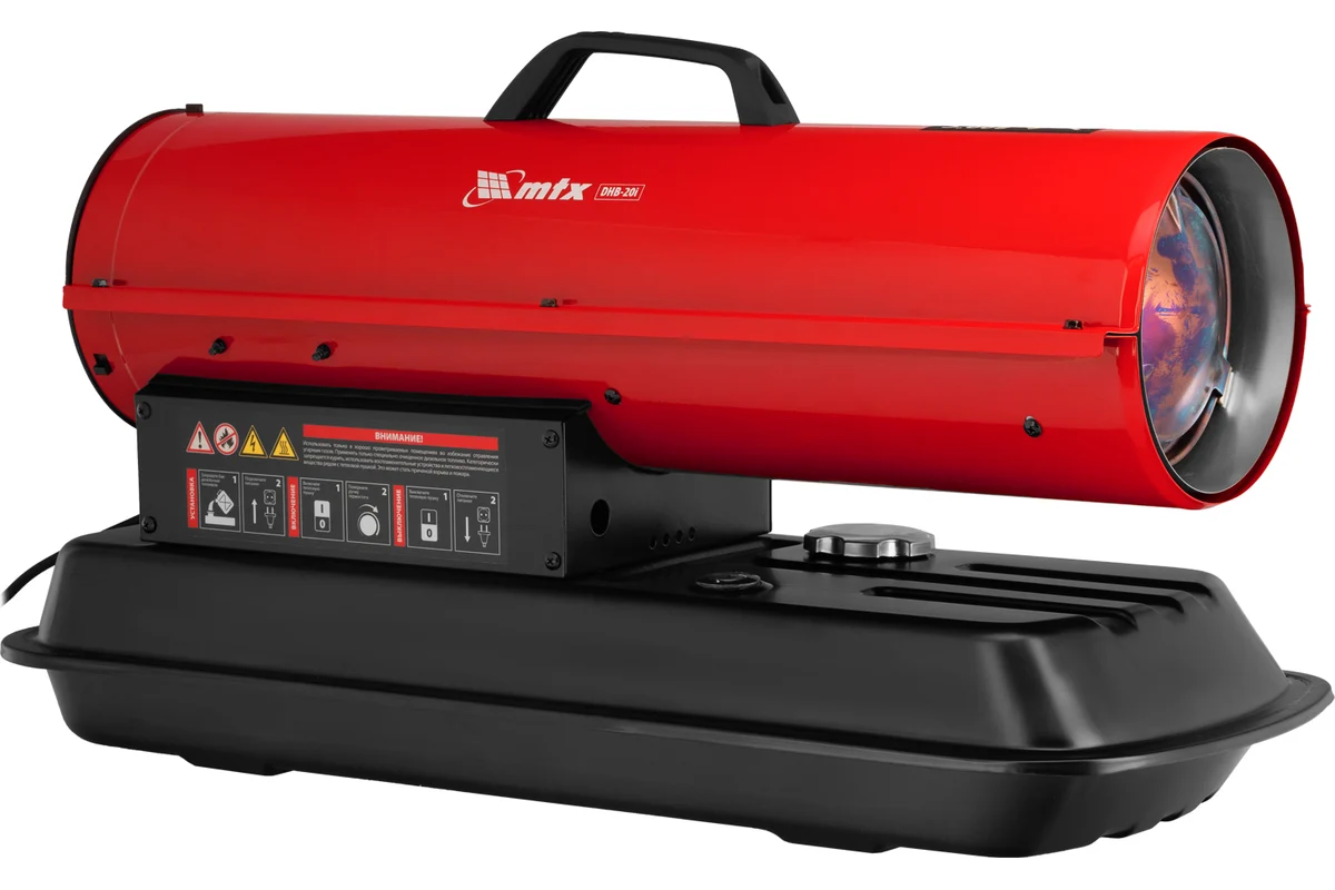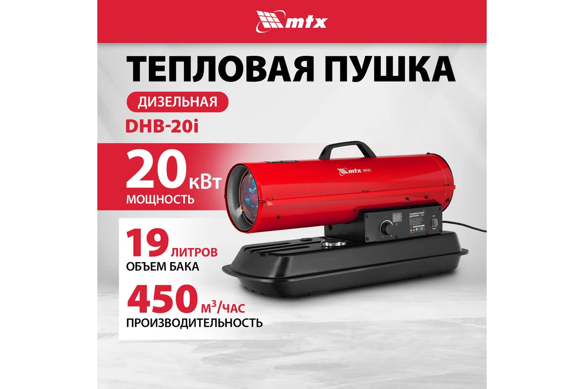 Дизельная тепловая пушка MTX DHB-20i, нагрев прямой, мощность 20 кВт, площадь обогрева 200 м2, объем бака 19 л, расход воздуха 450 м³/ч