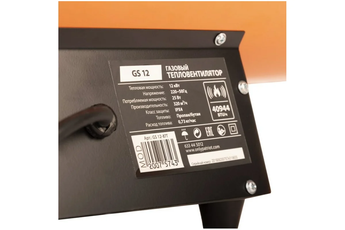 Газовая тепловая пушка Patriot GS-12 633445012 служит для обогрева открытых площадок и вентилируемых помещений, широко используется на строительных площадках. Для удобства транспортировки сверху на корпусе пушки расположена удобная ручка. Устройство отличается простотой и удобством в эксплуатации, все органы управления расположены в нижней части подставки. Для более продолжительного срока службы аппарата предусмотрена система защиты от самовозгорания и от утечки газа.