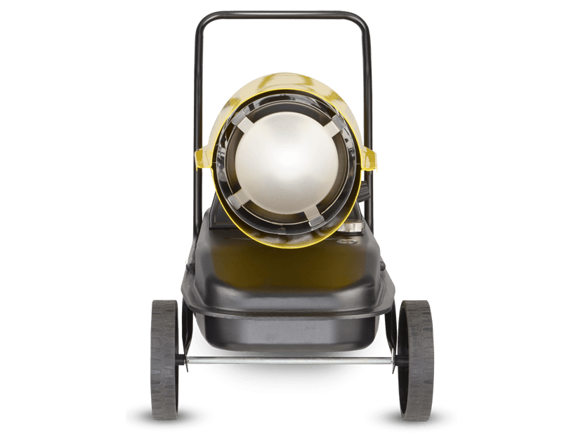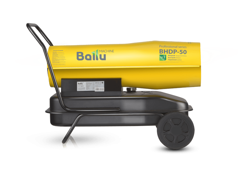Воздухонагреватель дизельный прямого нагрева Ballu BHDP-50 серии Tundra предназначен для обогрева нежилых помещений и локального прогрева рабочих поверхностей. Тепловая мощность прибора составляет 50кВт. При работе дизельной пушки воздушный поток, проходя через защитную решётку – втягивается в камеру сгорания. Там он смешивается с распылённым форсункой дизельным топливом, которое при помощи мощного насоса под высоким давлением подаётся из топливного бака, образуя воздушно – топливную смесь. При помощи 12kV электродов смесь поджигается и сгорает, а затем - выбрасывается наружу, смешиваясь с продуктами сгорания и с основной массой поступаемого воздуха, тем самым нагревая его. Теплоотражающий экран, расположенный в передней торцевой части корпуса прибора- служит препятствием для вырывающегося открытого пламени и обеспечивает равномерный прогрев помещения либо обогреваемой рабочей поверхности.