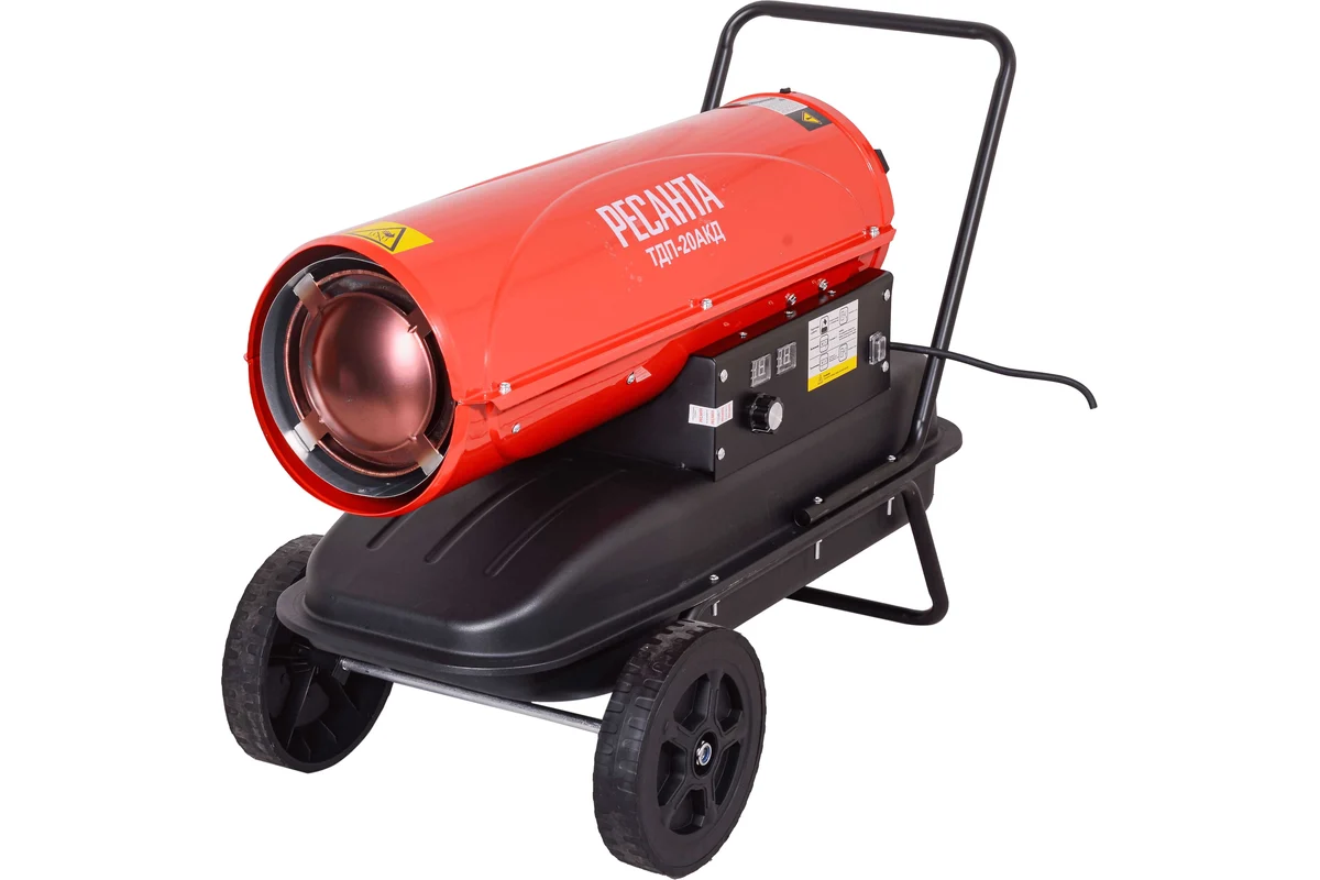 Тепловая пушка дизельная Ресанта ТДП-20АКД (67/1/43), дизельная, управление механическое, тепловая мощность 20 кВт, площадь обогрева 200 м2.