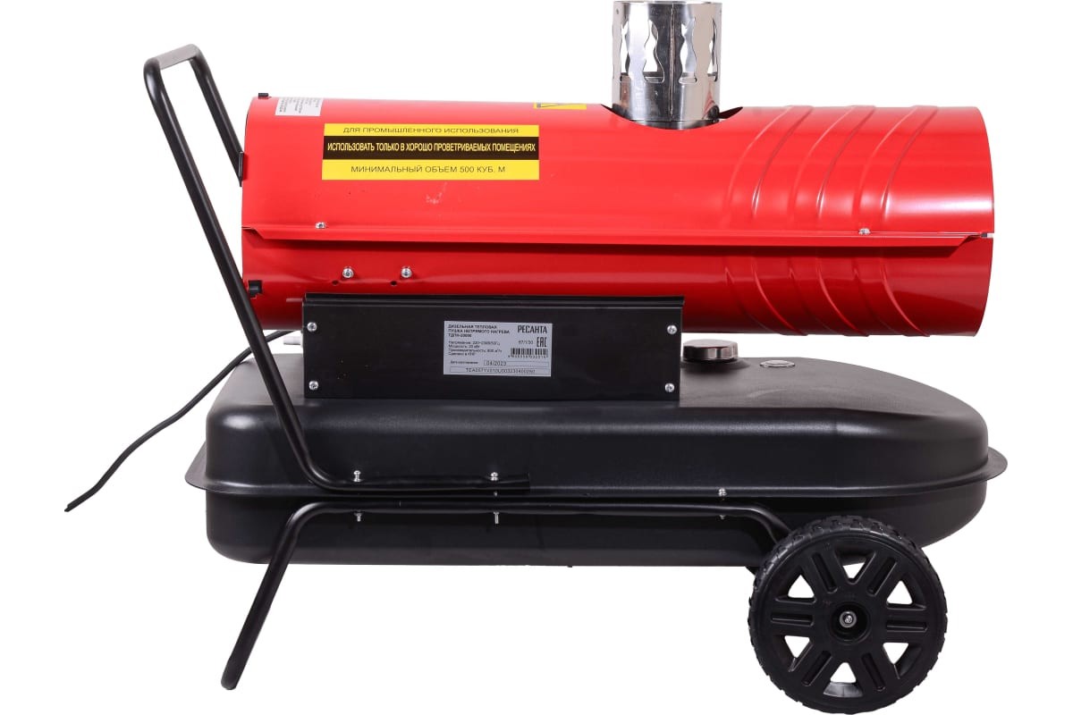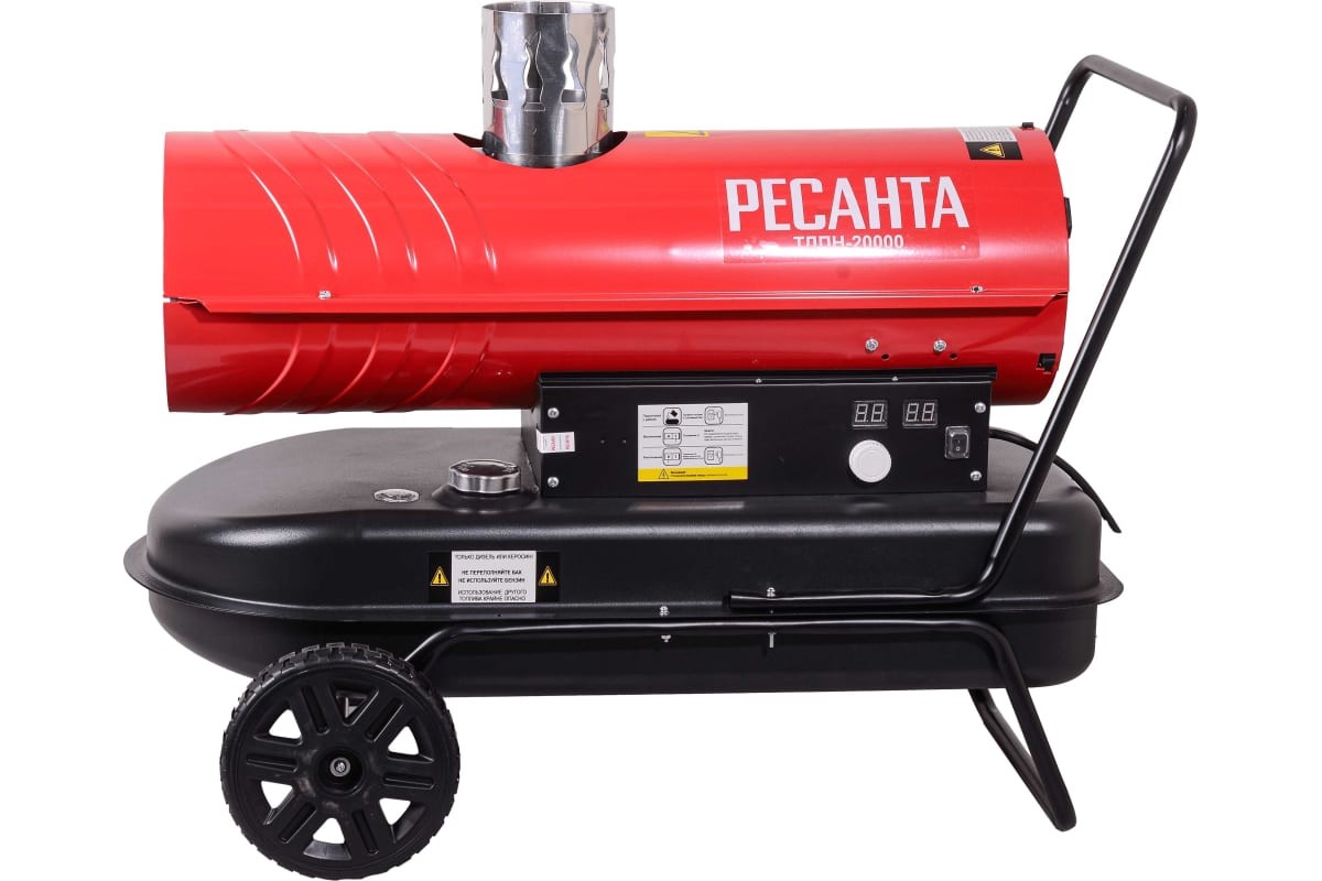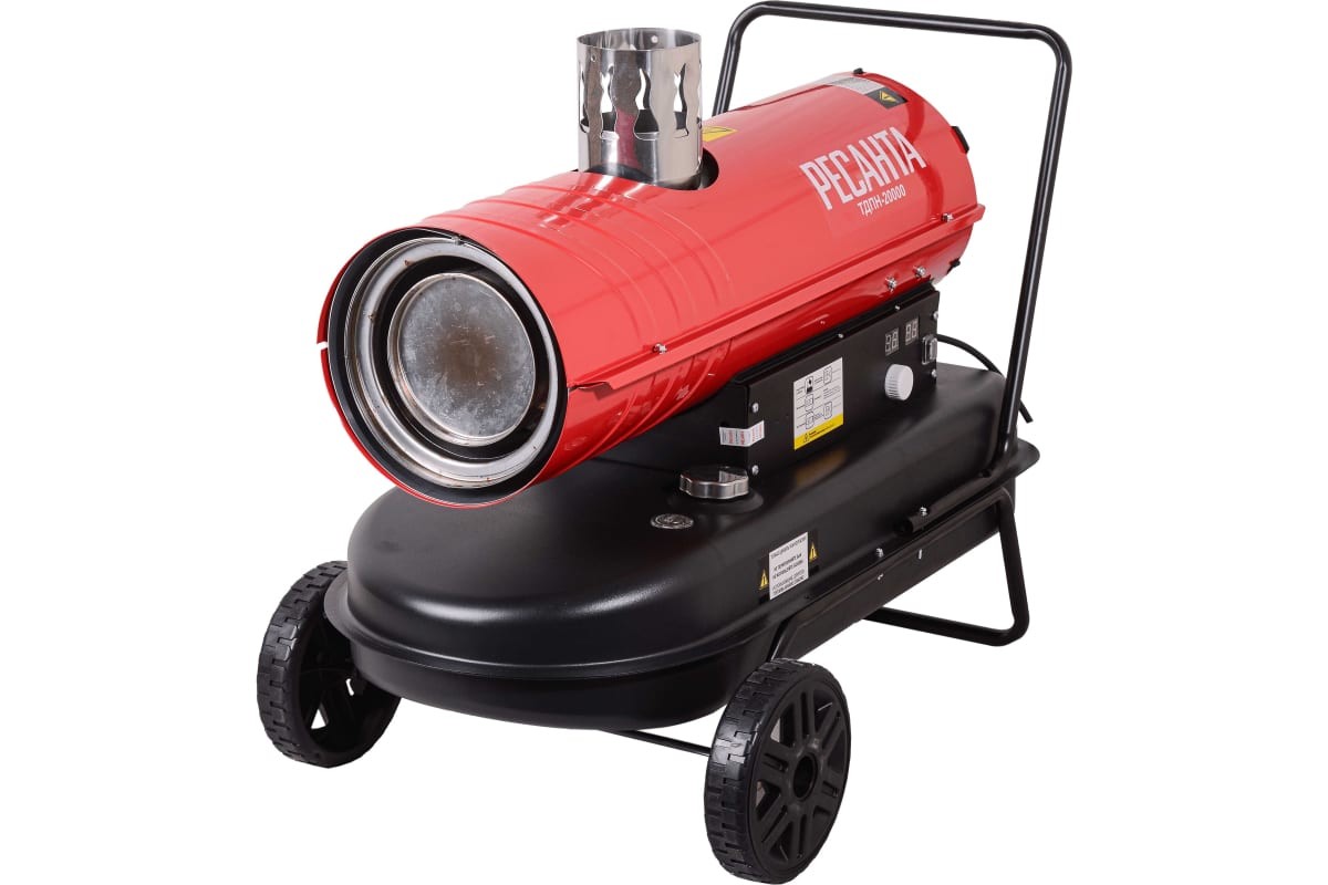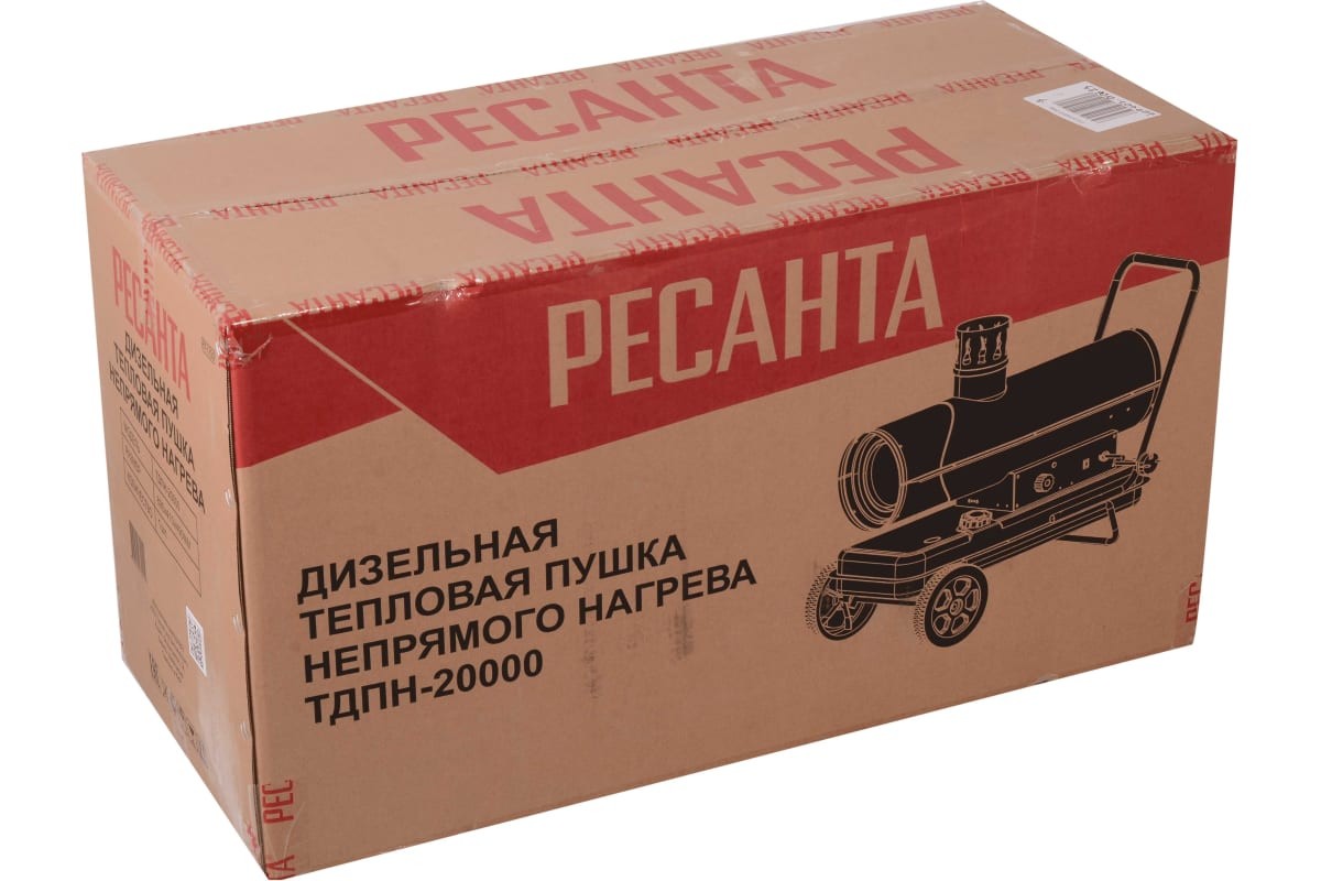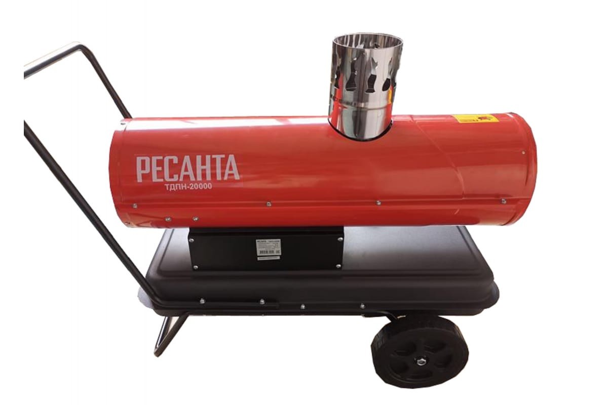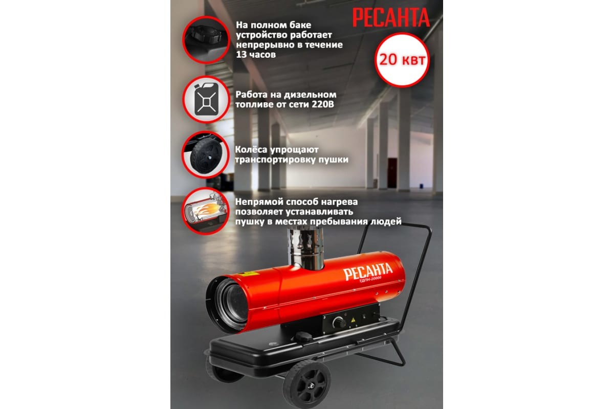 Мощная тепловая пушка Ресанта ТДПН-20000 с баком объёмом 36 л работает на дизельном топливе и подходит для обогрева нежилых помещений: складов, строительных объектов и производственных цехов. Теплопушка также может использоваться для усиления вентиляции. Ресанта ТДПН-20000 подходит для экономичного и быстрого обогрева помещений большой площади. Мощность дизельной теплопушки составляет 20 кВт. При этом её производительность достигает 800 м³/ч, а расход топлива – 1,58 кг/ч. Благодаря непрямому нагреву пушка также подходит для эксплуатации в помещениях с людьми. Для этого необходимо снабдить её системой отвода отработанных газов.
