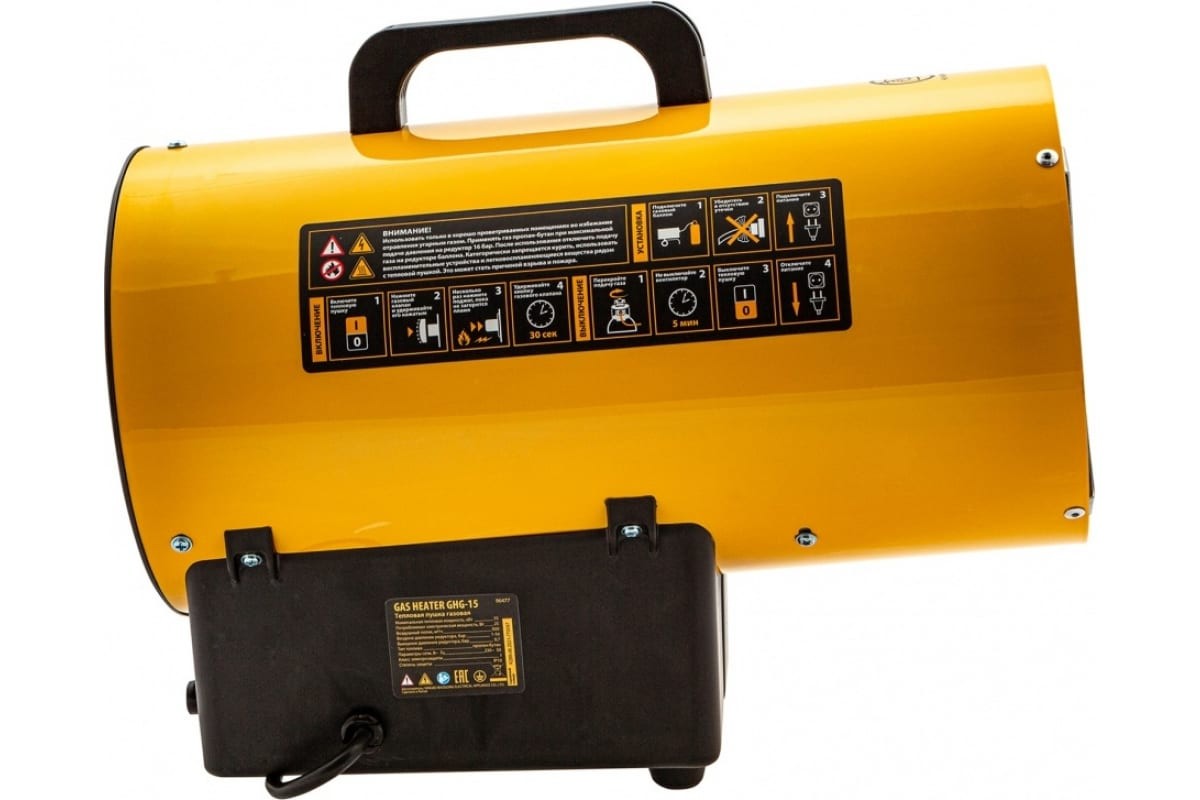 Газовая тепловая пушка Denzel GHG-15 имеет тепловую мощность 15 кВт и применяется для работы в мастерских, гаражах, строящихся объектах, а также нашли особую популярность при установке натяжных потолков. Тепловая пушка отличается высокой производительностью 500 м3/ч при экономичном расходе топлива 1,0 кг/ч и компактных габаритах.