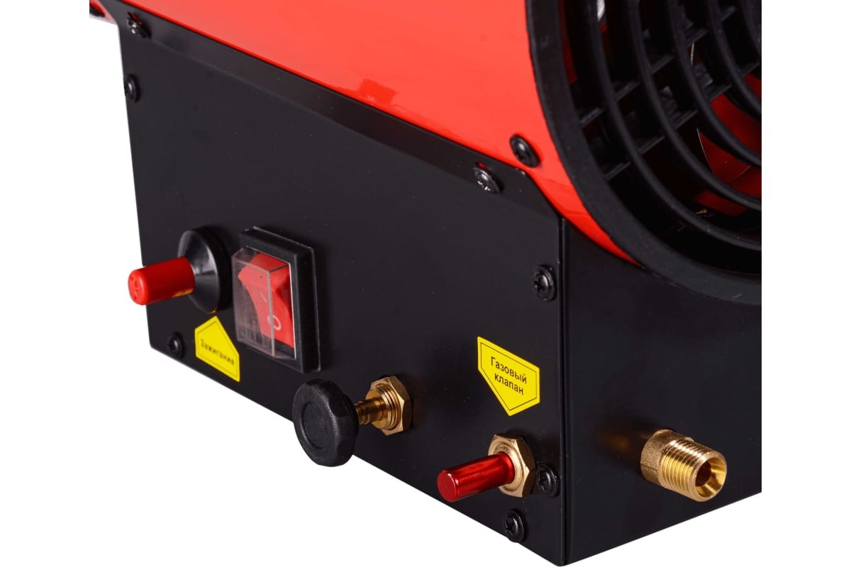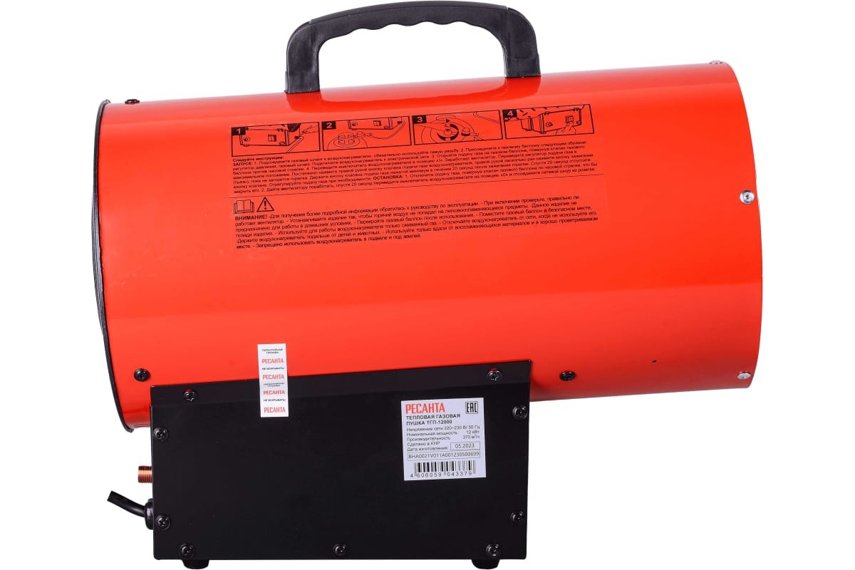 Тепловая газовая пушка РЕСАНТА ТГП-12000 - воздухонагреватель, работающий на сжиженном газовом топливе. Топливо необходимо для получения горячей атмосферы в камере сгорания, а электроэнергия, подводимая к устройству, необходима для питания вентилятора, нагнетающего воздух, и для функционирования автоматики.