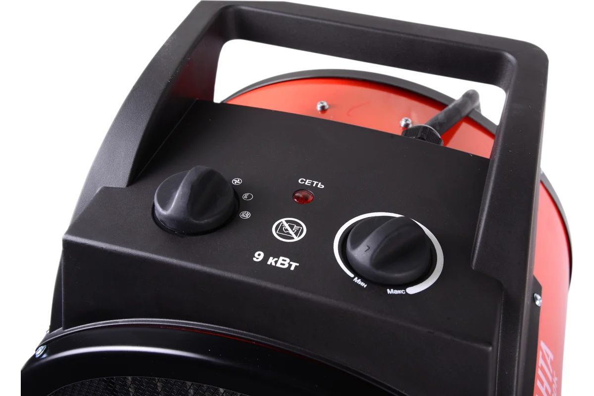 Тепловая электрическая пушка ТЭПК-9000K Ресанта максимальная потребляемая мощность 9 кВт, производительность теплого воздуха 720 м³/ч, объем обслуживаемого помещения 90 мᵌ, напряжение 380 В, керамический нагревательный элемент, автоотключение, защита от перегрева.