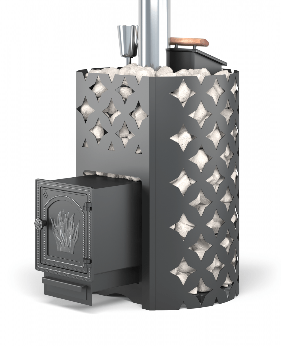 Регулировка скорости горения дров осуществляется за счёт изменения положения зольного ящика, который выполняет функции заслонки для воздушного потока. При закрытом ящике интенсивность поступления воздуха в топку минимальная, при открытом – максимальная. Топочный тоннель из особо прочной стали предназначен для вывода топочной дверцы в смежное с парилкой помещение. Длина тоннеля достаточна для прохождения через стену толщиной 20 сантиметров. Печь ЭТНА ЗК 18 оснащается верхним патрубком для подключения дымохода. На патрубок можно установить одноконтурную трубу или чугунный шибер диаметром 120 мм. Дверка печи (ДТ-4) изготовлена из высококачественного чугуна, не меняющего своих пропорций при длительном нагреве. Через дверку проводится обслуживание печи, подкладывание дров и контроль горения топлива. Дверка делает топку печи безопасным и удобным процессом. Конструктивно дверка вынесена в смежное с парилкой помещение (предбанник, комната отдыха), откуда и производят обслуживание топочного пространства. Для устройства наружной открытой каменки печь ЭТНА ЗК 18 оснащается металлическим кожухом с прорезным рисунком оригинального дизайна. Пространство между печью и кожухом из двухмиллиметровой стали заполняется камнями для бани, которые выполняют роль теплонакопителя, перераспределяют тепло от стенок топки и защищают парящихся от жёсткого инфракрасного излучения. Воду подают на нагретые камни, с которых полученный пар распространяется по всему объёму парной. Кожух диаметром 560 миллиметров вмещает в себя до 110 килограммов камней крупной и средней фракции.