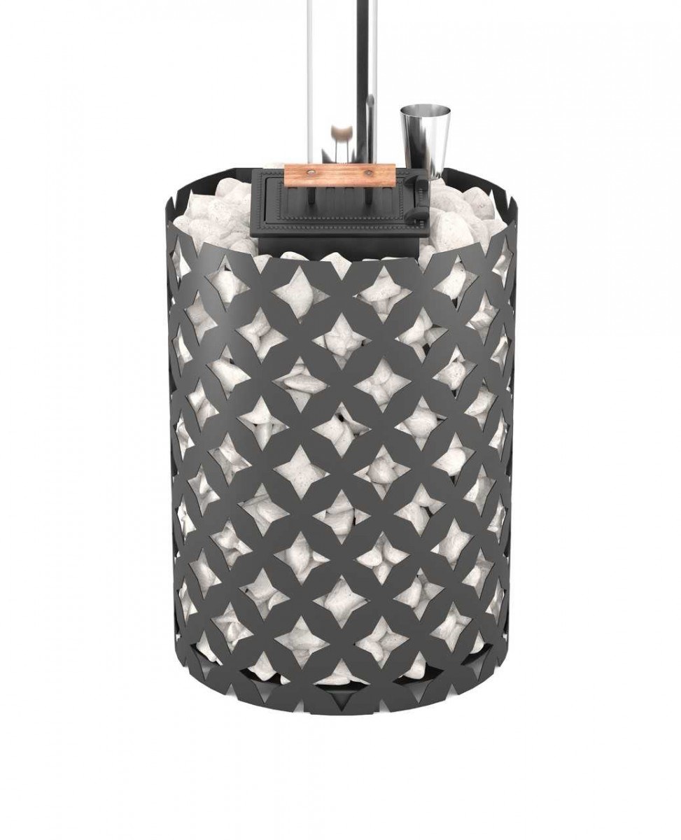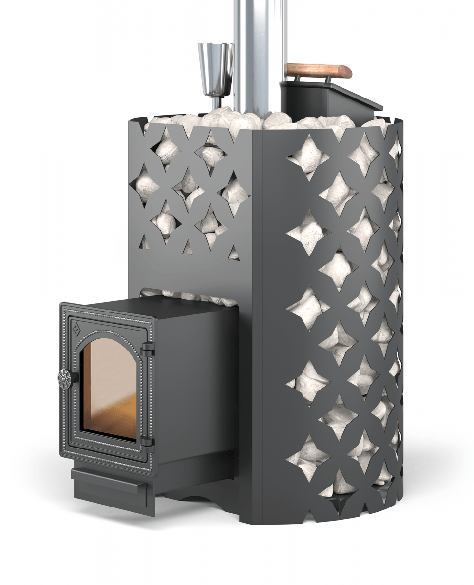 Дверка печи (ДТ-4С) изготовлена из высококачественного чугуна, не меняющего своих пропорций при длительном нагреве. Через дверку проводится обслуживание печи, подкладывание дров и контроль горения топлива. Дверка делает топку печи безопасным и удобным процессом. Конструктивно дверка вынесена в смежное с парилкой помещение (предбанник, комната отдыха), откуда и производят обслуживание топочного пространства. Для устройства наружной открытой каменки печь ЭТНА ЗК 18 оснащается металлическим кожухом с прорезным рисунком оригинального дизайна. Пространство между печью и кожухом из двухмиллиметровой стали заполняется камнями для бани, которые выполняют роль теплонакопителя, перераспределяют тепло от стенок топки и защищают парящихся от жёсткого инфракрасного излучения. Воду подают на нагретые камни, с которых полученный пар распространяется по всему объёму парной.