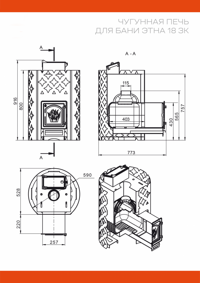 Стекло изготовлено из керамического сплава, выдерживающего температурные нагрузки до 600 градусов при постоянном нагреве и хорошо переносящего кратковременные перепады температуры (например, попадание воды на стекло). Толщина стекла 4 миллиметра, пространство между стеклом и рамкой герметично заполнено термостойким шнуром. Ручка двери при закрывании плотно притягивает полотно дверки к рамке, что предотвращает попадание дыма и горящих газов в помещение. Банная печь ЭТНА ЗК 18 ДТ-4С изготовлена из чугуна высокого качества. Материал с высокой теплопроводностью, чугун быстро передаёт энергию сжигаемого топлива наружу, в пространство парной. Толщина деталей корпуса составляет 6-8 миллиметров.