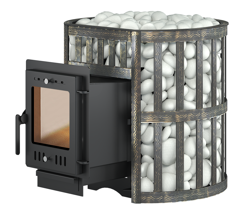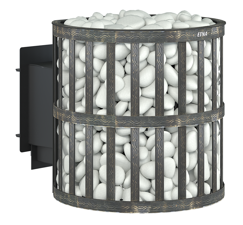 Для устройства наружной открытой каменки печь ЭТНА 24 (210) М оснащается сеткой из стальной ленты. Узор на наружной поверхности сетки патинирован термостойкой бронзовой краской. Пространство между печью и сеткой заполняется камнями для бани, которые выполняют роль теплонакопителя, перераспределяют тепло от стенок топки и защищают парящихся от жёсткого инфракрасного излучения. Воду подают на нагретые камни, с которых полученный пар распространяется по всему объёму парной.