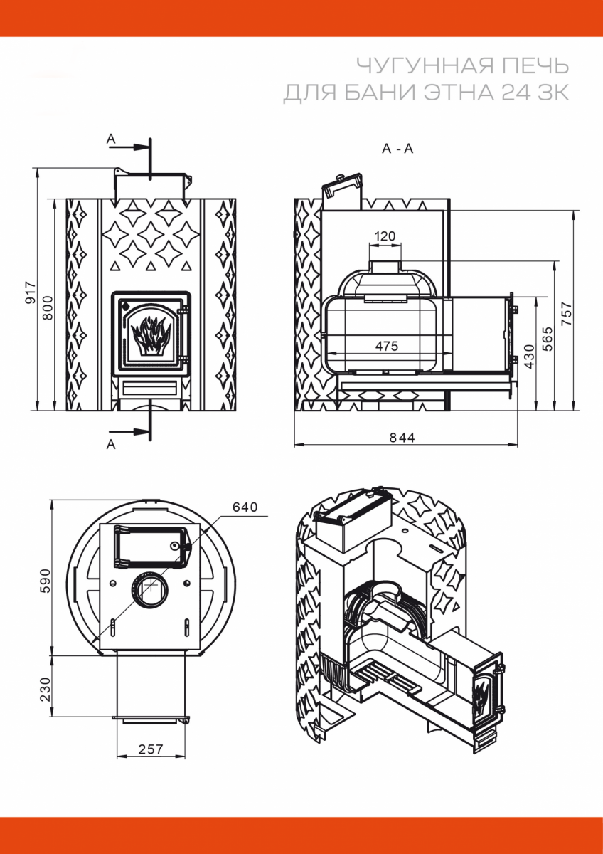 Корпус печи состоит из трёх элементов, собираемых на болтовых соединениях. При сборке между элементами корпуса прокладывается термостойкий керамический шнур, предотвращающий прорыв дымовых газов и пламени в помещение. В нижней части топочной камеры размещается чугунный колосник, предназначенный для подачи воздуха на дрова снизу. Для повышения теплоотдачи и максимального использования энергии горения дров в верхней части печи расположен пламегаситель, изменяющий направление движения дымовых газов и обеспечивающий полное сгорание. Чугунная деталь перекрывает прямой путь пламени и газов в дымоход, что улучшает тепловые показатели печи ЭТНА ЗК 24.