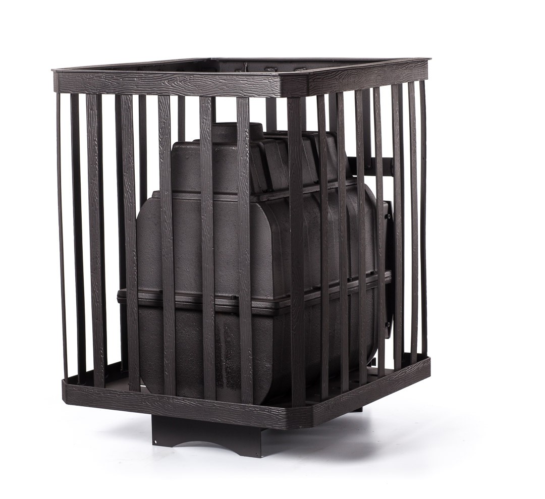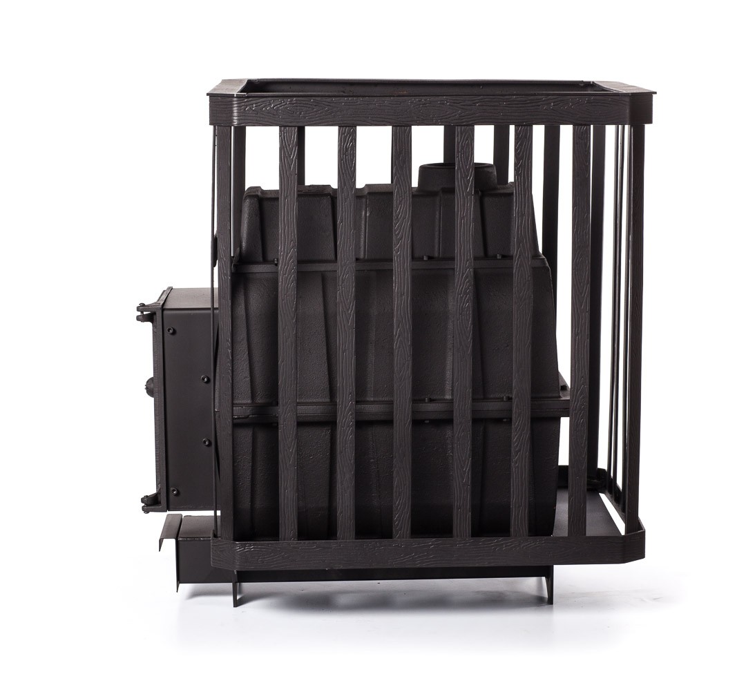 Печь предназначена для отопления парильных помещений 14-24 куб. м. Топка печи чугунная. Каменка в виде сетки из кованной стали. Топливный канал без выноса для топки печи из парильного помещения. Топочная дверца чугунная, размер 290х297 мм. Загрузка дров фронтальная. Диаметр дымохода 115 мм. Расположение дымохода сверху. Отделка антрацит.
