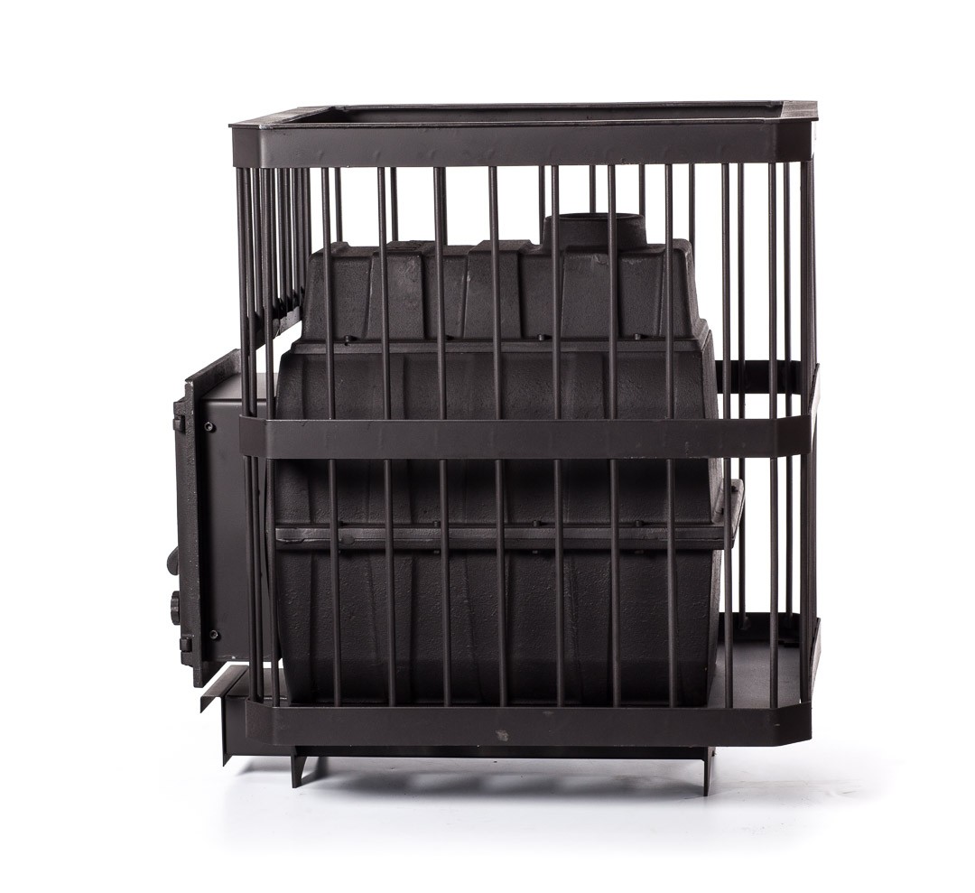 Печь предназначена для отопления парильных помещений объемом 14-24 куб. м. Топка печи чугунная. Каменка в виде сетки из стального прутка. Топочная дверца чугунная, размер 310х340 mm. Загрузка дров фронтальная. Диаметр дымохода 115 мм. Расположение дымохода - сверху. Отделка антрацит.