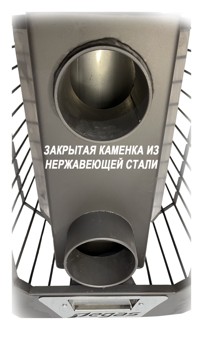 Печь оснащена закрытой каменкой из жаропрочной нержавеющей стали - это лучшие металлические печи для русской бани, в них каменка располагается внутри конструкции и таким образом, обеспечивается максимальный нагрев камней и длительное сохранение тепла, современный дизайн печей, закрытая каменка относится к невентилируемым системам, за счет этого создается равномерная температура без перегрева с поддержанием комфортного режима длительный период времени, пар мелкодисперсный, мягкий, с легкой структурой, наиболее нагруженные элементы печи изготовлены из 8 мм стали, корпус печи сформирован с интегрированными ребрами жёсткости, без применения сварки, что значительно снижает нагрузку на строение металла, тем самым увеличивает срок службы печи. Печь оснащена выносным топливным каналом, позволяющим топить его из смежного помещения, топка большой ёмкости, позволяет загрузить большое количество дров, чугунная колосниковая решетка, выдвижной зольный ящик, дополнительные отверстия для притока воздуха, позволяют произвести нужную регулировку горения, приёмная чаша-дозатор для подачи воды в закрытую каменку.