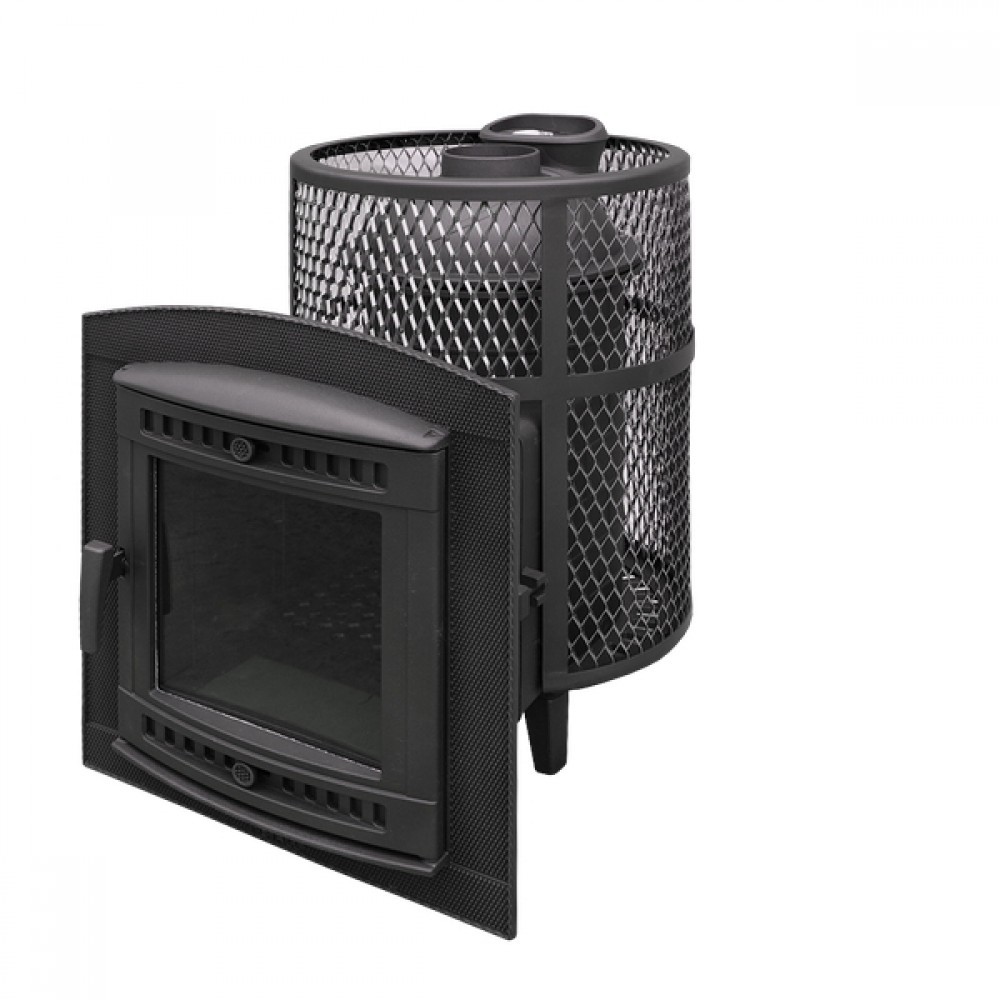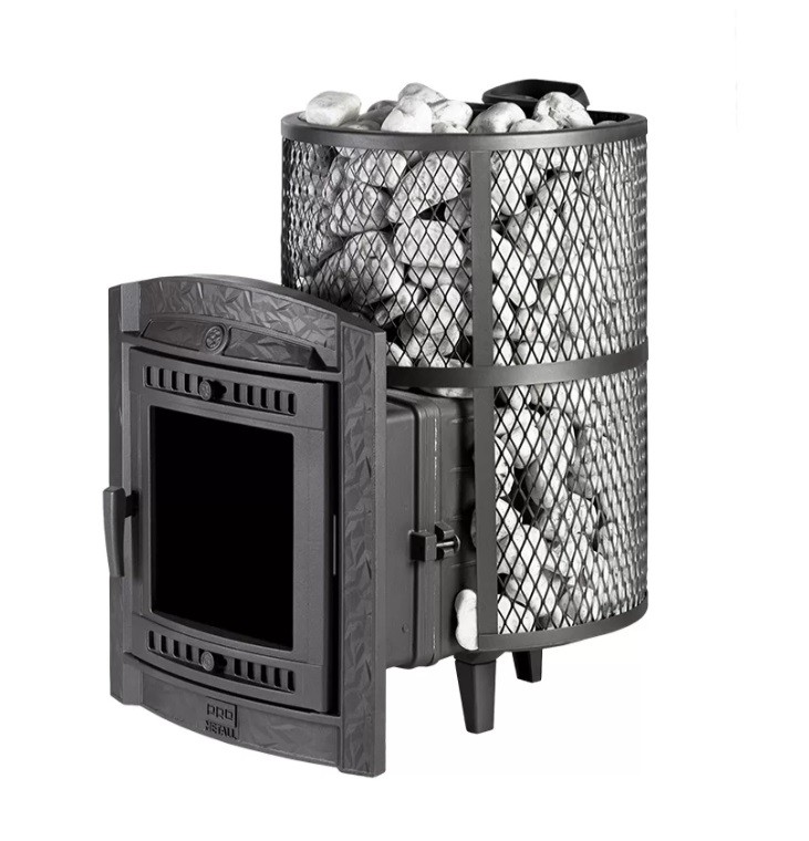 Печь для бани ProMetall Атмосфера L сетка нержавейка для парной объёмом до 24 м3, со стеклянной дверцей, чугунная топка, комбинированная каменка, выносная топка.