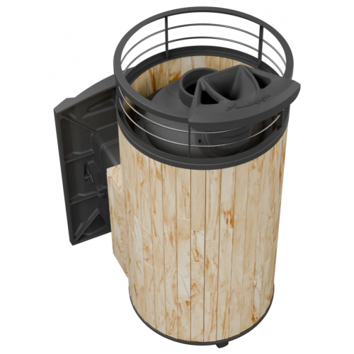 Модель с увеличенной каменкой и повышенной производительностью. Ламели из змеевика по периметру внешней каменки не только обладают хорошими теплонакопительными свойствами, но и придают печи оригинальный внешний вид.