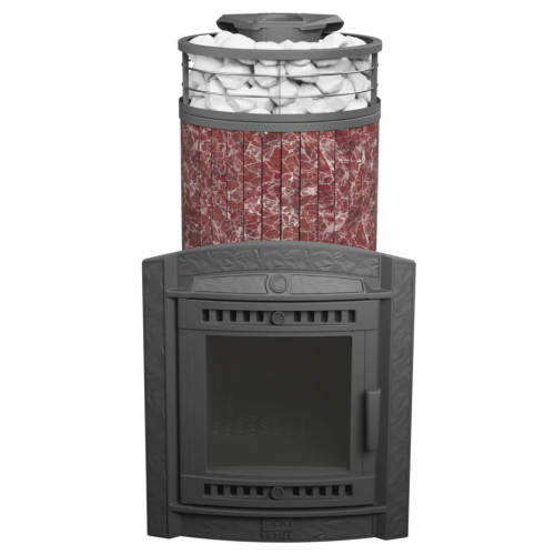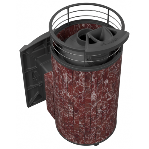 Модель с увеличенной каменкой и повышенной производительностью. Ламели из змеевика по периметру внешней каменки не только обладают хорошими теплонакопительными свойствами, но и придают печи оригинальный внешний вид.