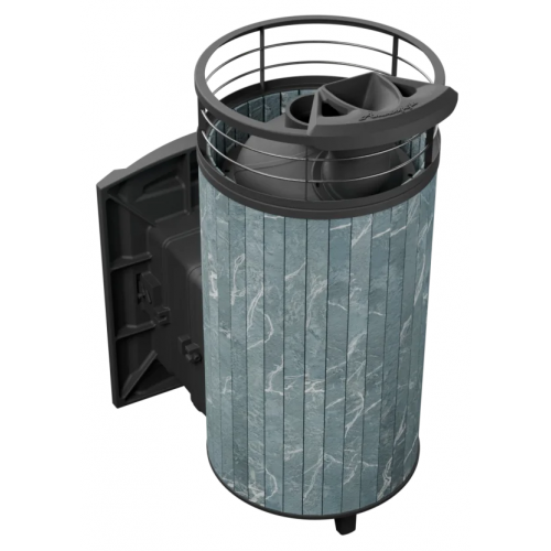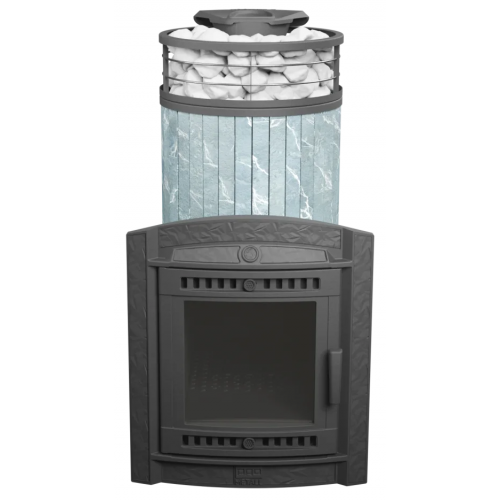 Модель с увеличенной каменкой и повышенной производительностью. Ламели из змеевика по периметру внешней каменки не только обладают хорошими теплонакопительными свойствами, но и придают печи оригинальный внешний вид.