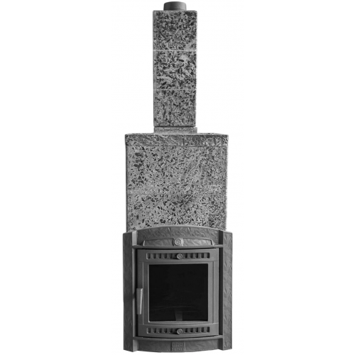Декоративный портал и выносная дверка печки также изготовлены из чугуна, с возможностью варьирования длины топочного тоннеля под необходимую толщину стенки. Большое термостойкое стекло в дверце имеет защиту от копоти воздушной специальной завесой. На раме дверцы установлены два воздухозаборника для подачи воздуха на горение. Предусмотрена возможность размещения дверцы как с левой, так и с правой стороны.