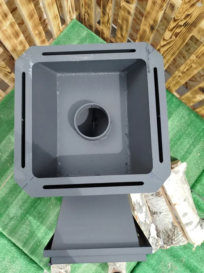 Для большей эффективности прогрева они спроектировали камеру сгорания таким образом, чтобы всё тепло от вторичного пламени сосредотачивалось в её верхней части. Она находится как раз в центре каменной кладки и поэтому качественно прогревает каждый камешек. Конвективно-вентилируемый кожух экранирует инфракрасное излучение и насыщает парную мягкими конвективными потоками тепла.