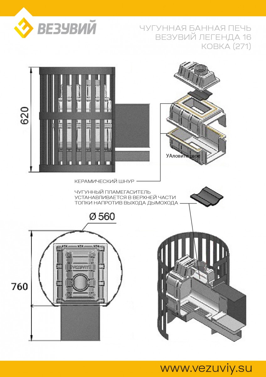 Печь для бани Везувий Легенда Ковка 16 (271) - чугунная печь для бани с кованной стальной сеткой для камней. Топка печи выполнена из двух отлитых частей стянута болтами, для герметичности соединения применяется уплотнительный шнур с рабочей температурой в 1200°C. В топке предусмотрен съемный чугунный зуб-отбойник для поворота пламени и увеличения КПД печи. Съемный отбойник пламени облегчает периодическую чистку печи от сажи. Снаружи на печь одевается кованная стальная сетка в которую закладываются камни. Большая масса камней позволяет надолго сохранять тепло и защищает от сильного инфракрасного излучения идущего от наружной стенки топки. Печь протапливается из соседнего с парной помещения бани (выносная топка).