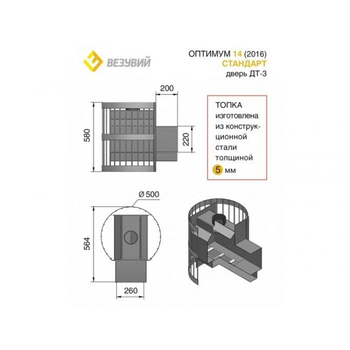 Печь для бани Везувий Оптимум Стандарт 14 (ДТ-3) благодаря упрощённому строению топки и использованию в ней минимально допустимой толщину металла является самой бюджетной моделью в своём классе. Печь для бани Оптимум укомплектована топочной чугунной дверцей и чугунным колосником. В конструкции данной печи предусмотрен топочный тоннель длиной 200 мм, при помощи которого печь топится из соседнего помещения, смежного с парильным.