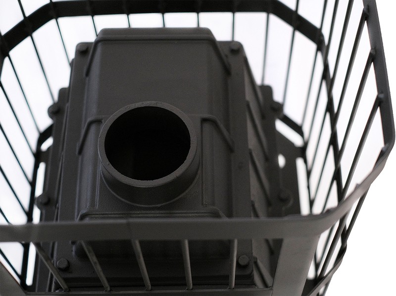 По периметру печи расположена сетчатая стальная конструкция, которая заполняется большим количеством камней, выполняющих функцию мощного аккумулятора и обладающей высокими теплоемкими свойствами. Масса камней, способных разместится в данной модификации печи составляет 180 кг, что создает неповторимую эстетику внутри бани и гармонизирует внутреннее пространство.