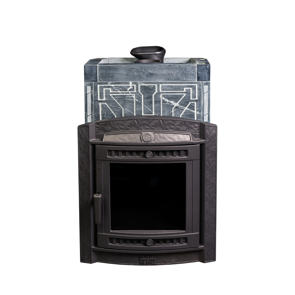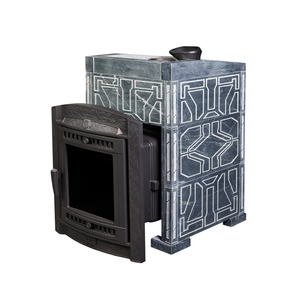 Печь банная ProMetall Атмосфера L в облицовке Талькохлорит Узор №7, дровяная, парилка 12-20 м³, объем топки 54 л, материал: нержавеющая сталь/чугун