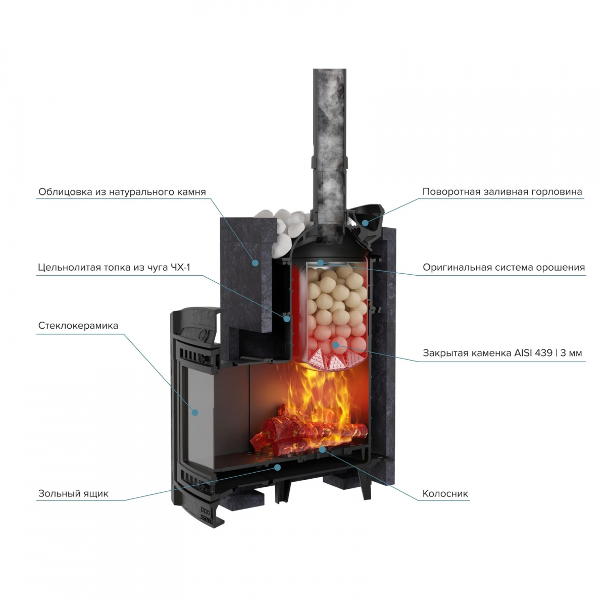 Печь банная ProMetall Атмосфера XL в облицовке Пироксенит Элит, дровяная, парилка 18-26 м³, объем топки 54 л, материал: нержавеющая сталь/чугун