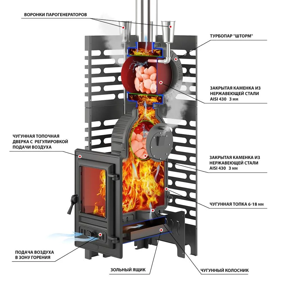 Чугунная печь Астон Шторм 18 состоит из двух вертикальных полукорпусов, соединяющихся на болтах. Система соединения паз-гребень обеспечивает герметичность топочной камеры даже при сильном длительном нагреве печи. Качественный чугун позволяет накапливать много энергии от горения дров и быстро передавать её камням, размещённым внутри печи и в сетке вокруг теплового агрегата.