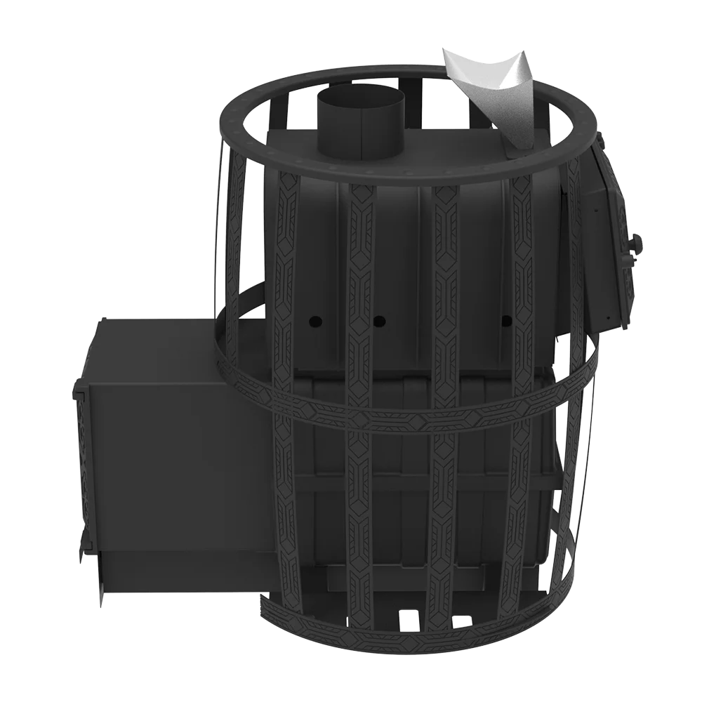 Доказана высокая стойкость к длительным режимам повышенной температуры свыше 600 °С и резкого, шокового, охлаждения водой, снегом, льдом! Мы усовершенствовали камеры сгорания наших чугунных банных печей и сделали их ЦЕЛЬНОЛИТЫМИ! Крышка с патрубком по умолчанию смонтирована ближе к задней части печи при необходимости её можно развернуть вперёд топки