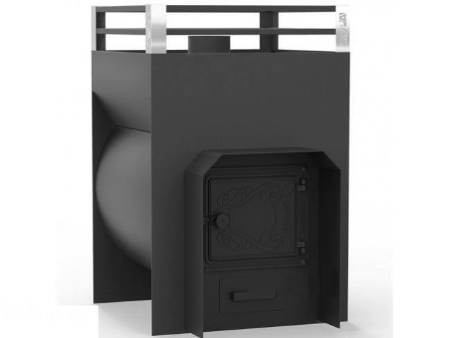 Печь при своих незначительных габаритах занимает немного места, но для ее установки требуется сооружение дополнительного фундамента и установка защитного экрана, который может быть выполнен как из чугуна, так и других негорючих материалов. Конструкция модели позволяет организовать процесс топки различными способами: непосредственно из помещения парной, из смежного помещения или с улицы.