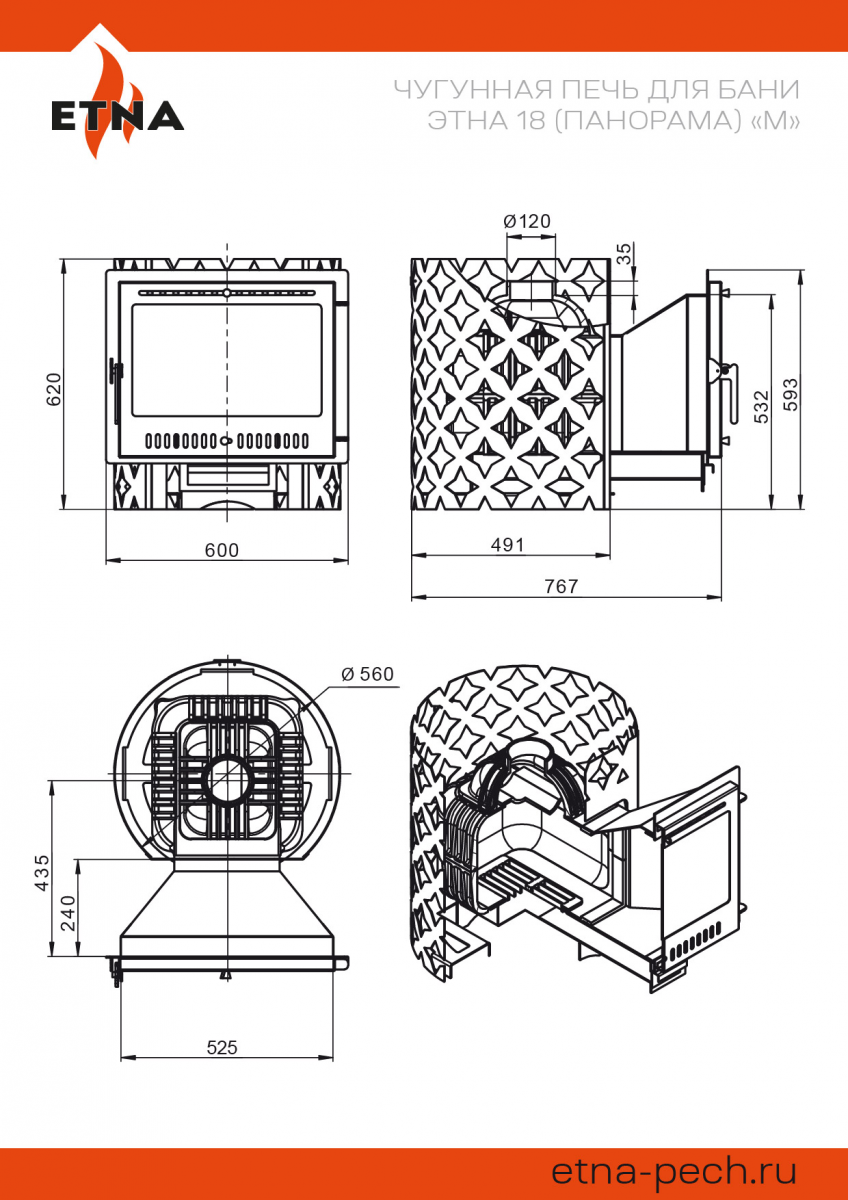 Топочный тоннель из особо прочной стали предназначен для вывода топочной дверцы в смежное с парилкой помещение. Длина тоннеля достаточна для прохождения через стену толщиной 20 сантиметров. Печь ЭТНА 18 оснащается верхним патрубком для подключения дымохода. На патрубок можно установить одноконтурную трубу или чугунный шибер диаметром 120 мм. Дверка печи (ЭТНА-Панорама) изготовлена из высококачественного чугуна, не меняющего своих пропорций при длительном нагреве. Через дверку проводится обслуживание печи, подкладывание дров и контроль горения топлива. Дверка делает топку печи безопасным и удобным процессом. Конструктивно дверка вынесена в смежное с парилкой помещение (предбанник, комната отдыха), откуда и производят обслуживание топочного пространства. Для устройства наружной открытой каменки печь ЭТНА 18 оснащается металлическим кожухом с прорезным рисунком оригинального дизайна. Пространство между печью и кожухом из двухмиллиметровой стали заполняется камнями для бани, которые выполняют роль теплонакопителя, перераспределяют тепло от стенок топки и защищают парящихся от жёсткого инфракрасного излучения. Воду подают на нагретые камни, с которых полученный пар распространяется по всему объёму парной. Кожух диаметром 560 миллиметров вмещает в себя до 110 килограммов камней крупной и средней фракции.