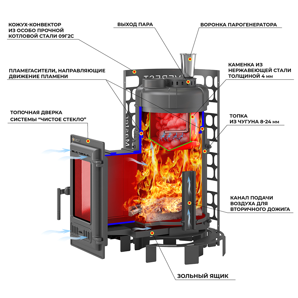 Для полного сгорания топлива в топке устроены каналы вторичного дожига, подающие воздух из поддувала в верхние точки камеры, в места скопления разогретых газов. Это обеспечивает максимальную эффективность горения и высокий КПД печи Эверест "Steam Master" 18 (310) ЧУГУН.
