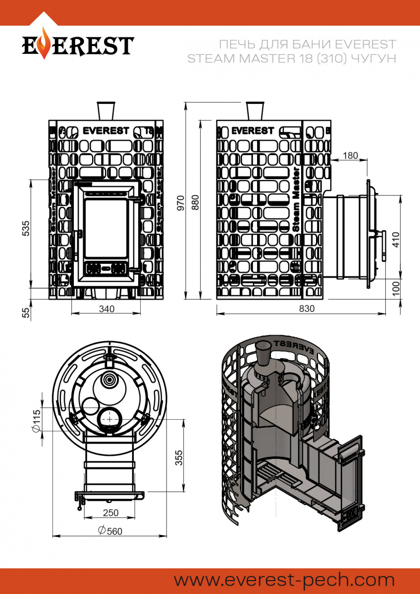 Печь для бани Эверест Steam Master 18 (310) ЧУГУН, тип каменки: закрытая, объём парного помещения: от 8 до 18 м3, с выносом, со стеклом