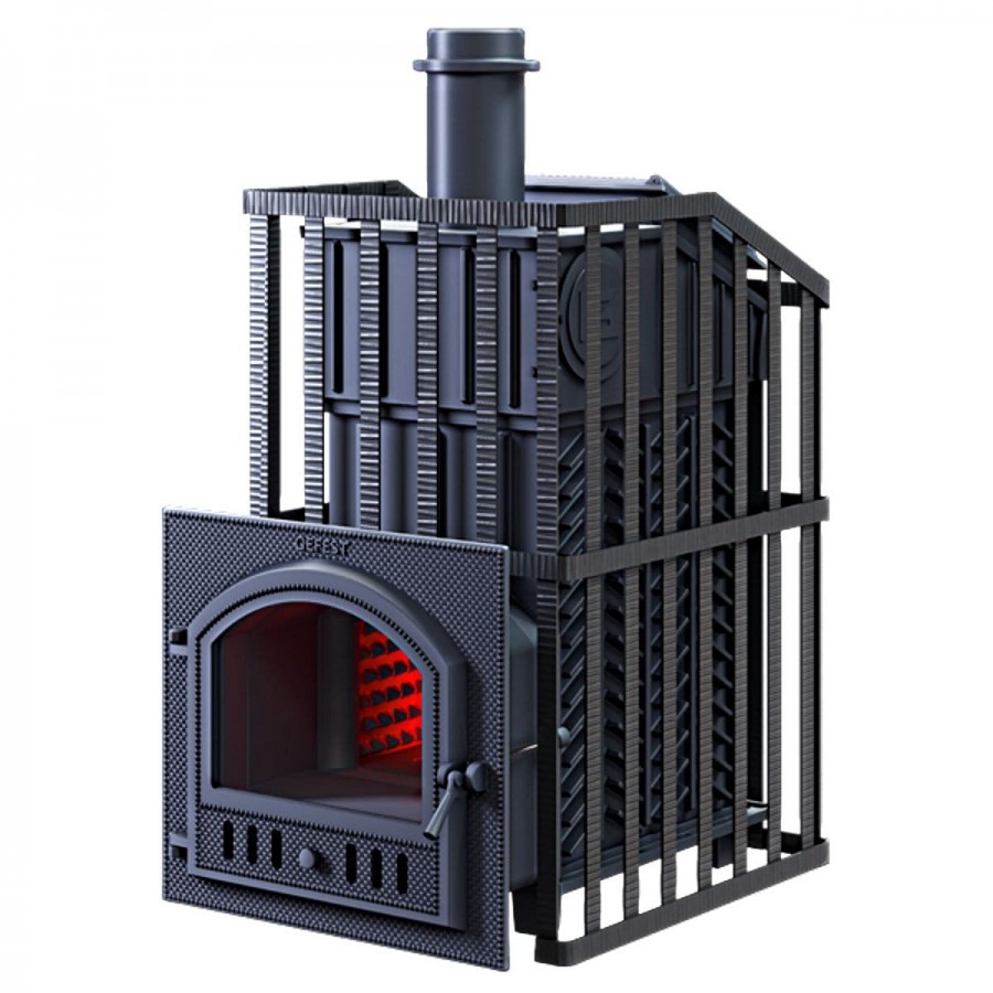 GFS Гефест ЗК Ураган 18 (П) - расширенный комплект печи GFS Гефест ЗК в сетке. Максимально приближенный вариант печи для режимов русской парной, имеющий непосредственно закрытую чугунным коробом каменку, дверцу для пара с ручкой из бука, увеличенную до 50 см чугунную стартовую трубу. Печь легко модернизируется до полноценной печи предназначенной для Русской бани путем замены стальной сетки на каменную облицовку без демонтажа дымохода.