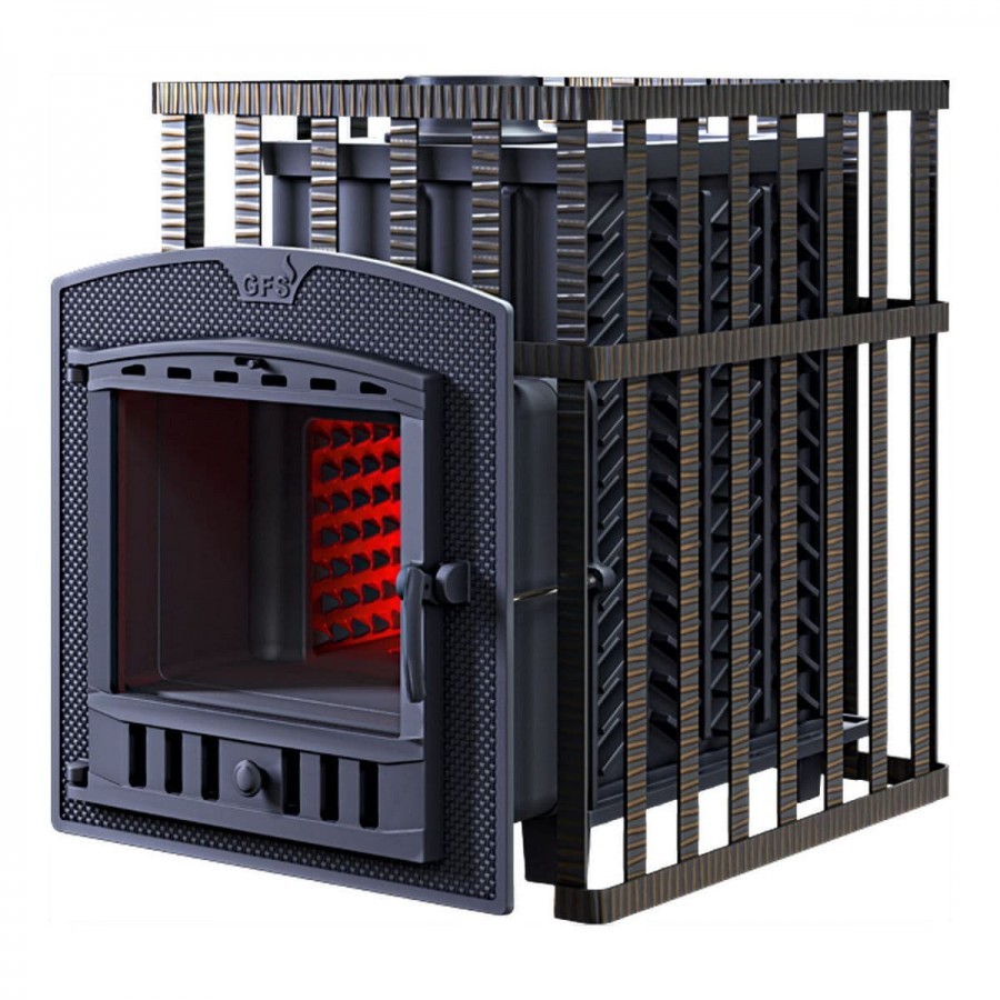 Модель GFS ЗК 25 (П2) в сетке - печь с усиленной каменкой большей массы, с единым углублением внутрь топки для дополнительной укладки чугунного заряда. Теплосъемные шипы, со стороны горения пламени, в разы увеличивают площадь соприкосновения огня с каменкой и ускоряют передачу тепла, а также способствуют лучшему дожигу смешивая потоки пламени и воздуха, поступаемого из воздушника. Эти усовершенствования значительно повышают мощность парообразования печи и выдают большее количество пара при непрерывной подаче воды. Каменка печей GFS Гефест-ЗК является незаливаемой.