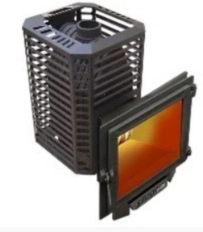 Печь для бани Пегас 16 чугун панорама сетка премиум, открытая каменка, топка с выносом, материал топки чугун, для парной 6-16 м3, масса камней 120 кг