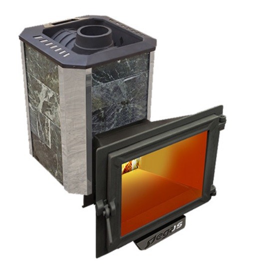 Печь для бани Пегас 16 чугун панорама в камне змеевик, открытая каменка, топка с выносом, материал топки чугун, для парной 6-16 м3, масса камней 40 кг