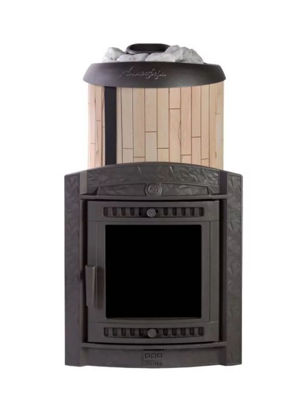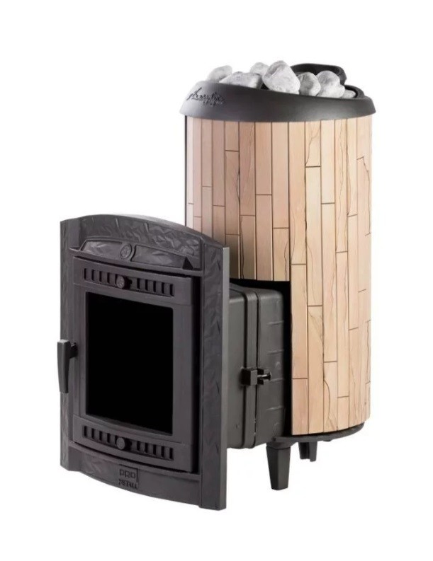 Печь для бани ProMetall Атмосфера XL+ Ламели Окаменевшее дерево наборный рисунок, чугун, закрытая каменка, топка с выносом, для парной 18-32 м3, масса камней 25-30 кг