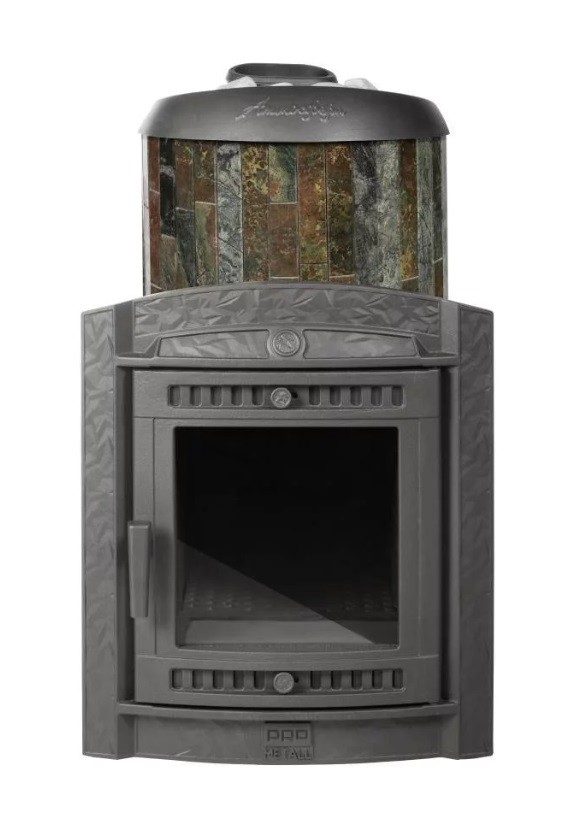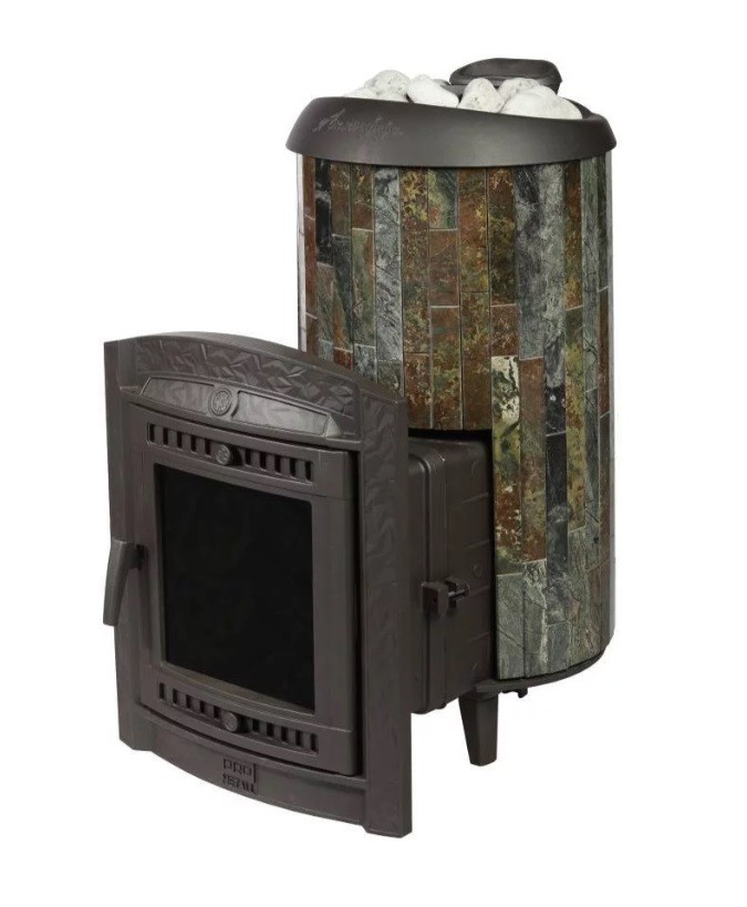 Печь для бани ProMetall Атмосфера XL+ Ламели Жадеит наборный рисунок, чугун, закрытая каменка, топка с выносом, для парной 18-32 м3, масса камней 25-30 кг