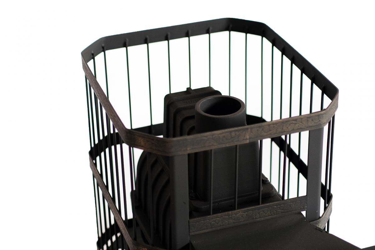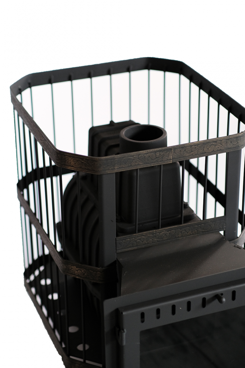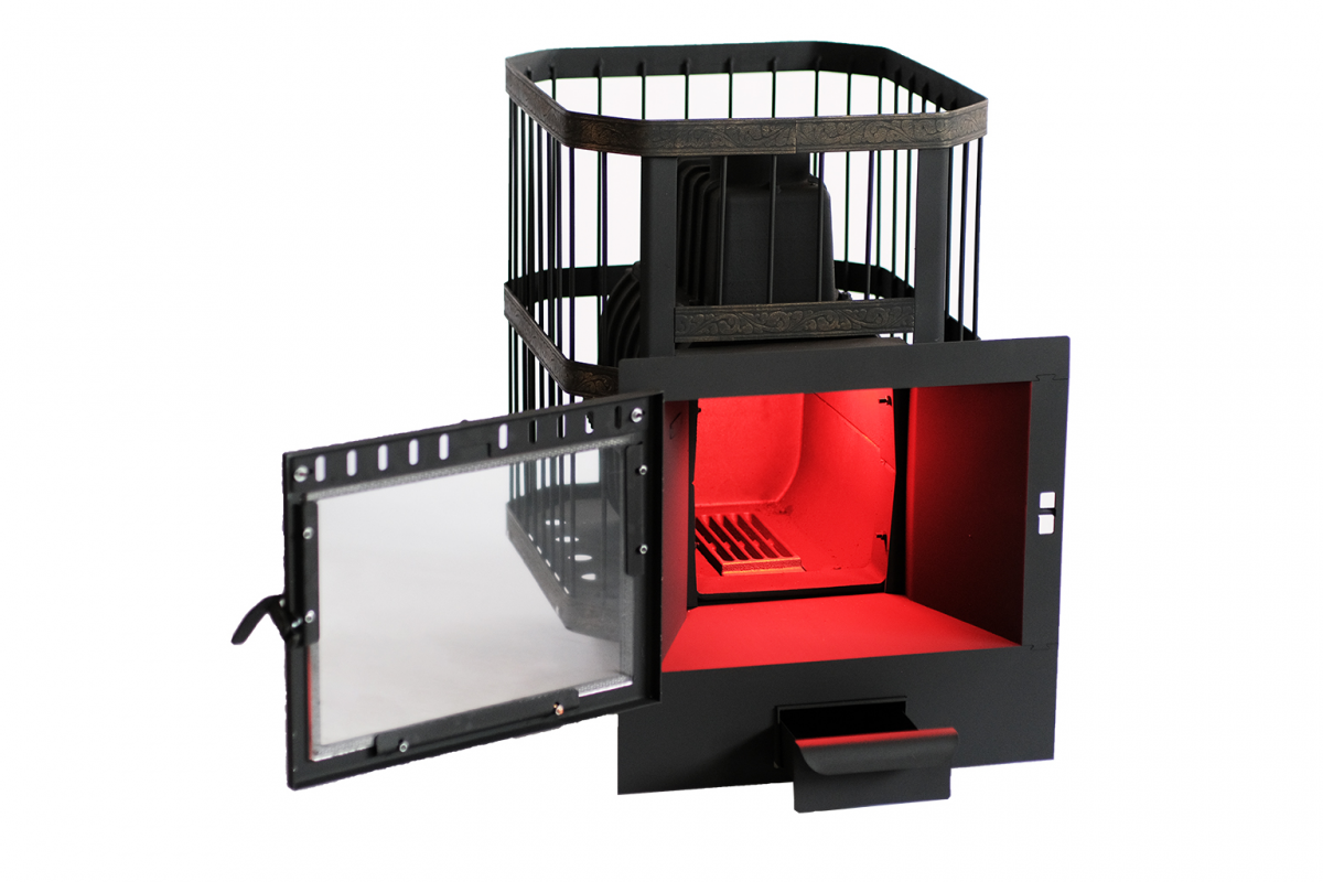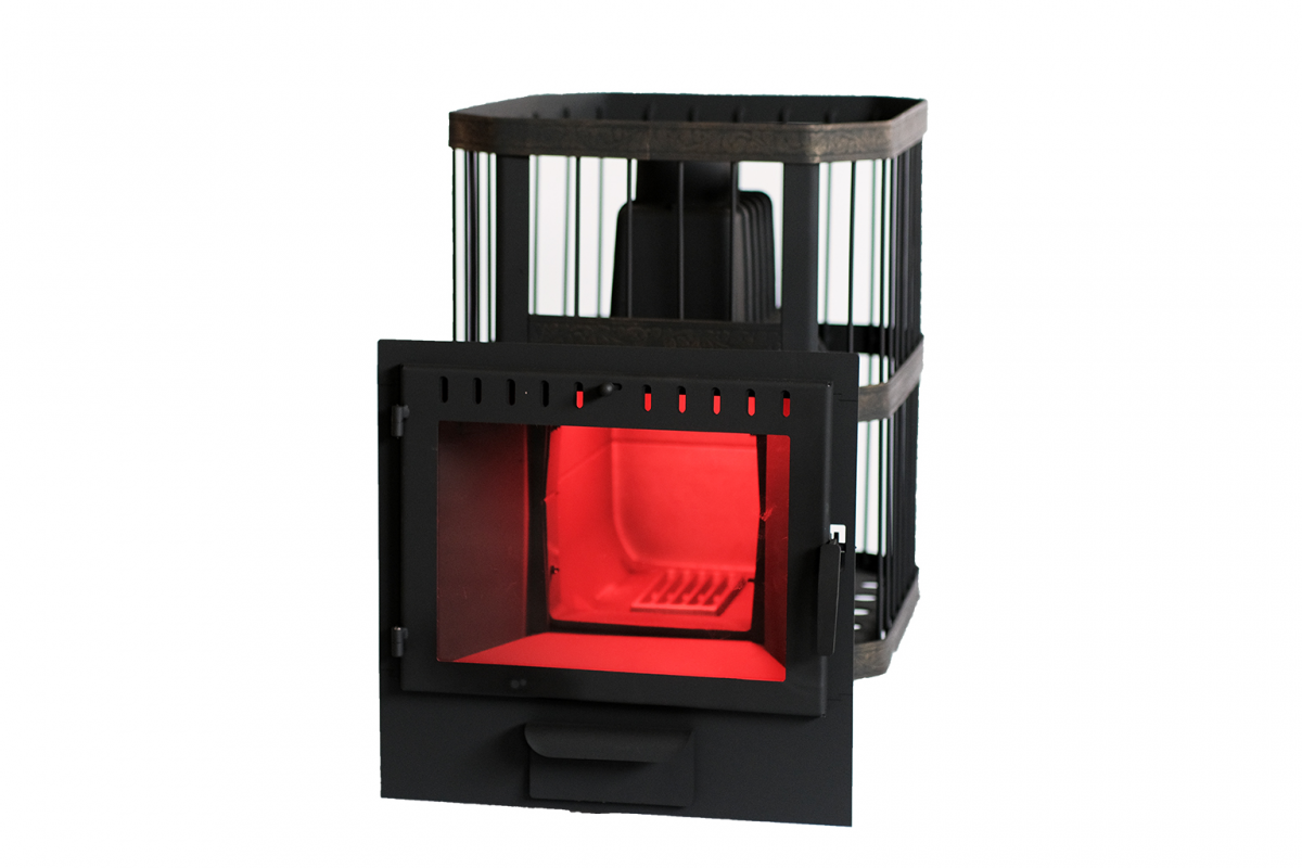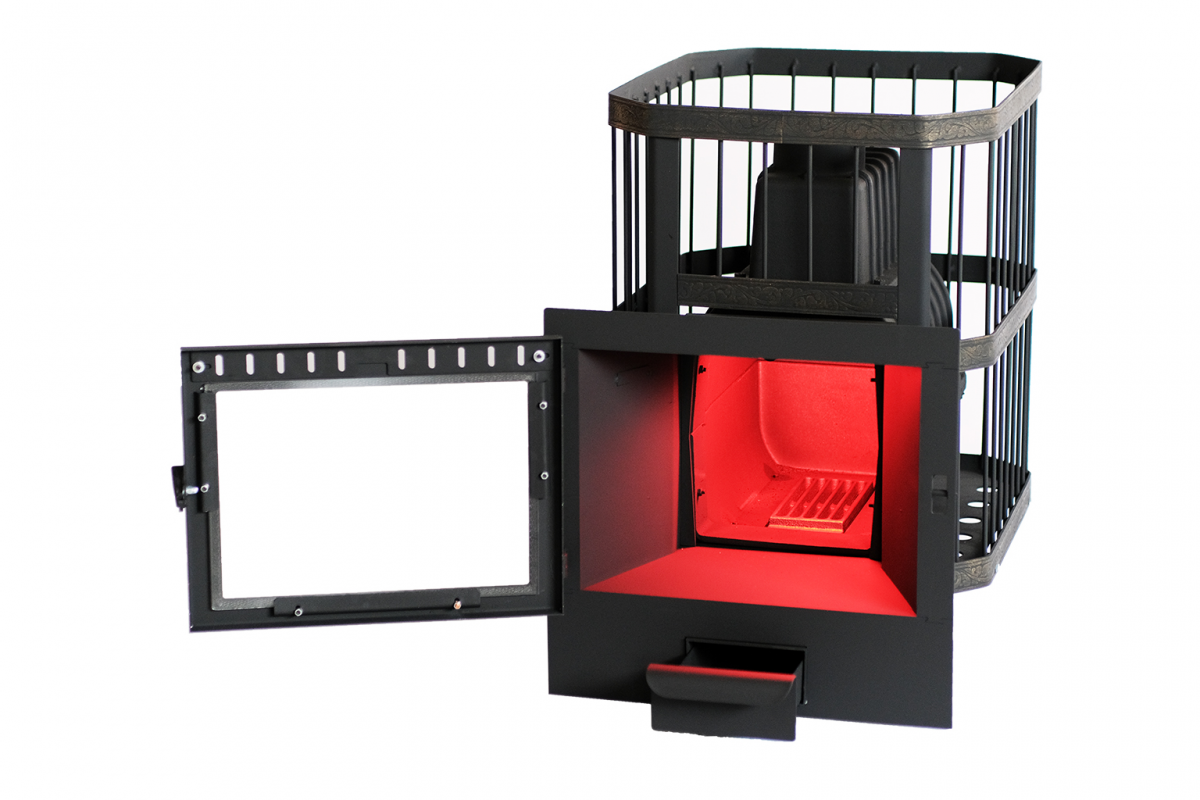 Чугунная банная печь "Сибирь-22" с панорамной дверцей в облицовке сеткой для камней - один из доступных вариантов среди многообразия чугунных банных печей "Сибирь". Печь представляет собой традиционную сборную чугунную конструкцию, состоящую из 3-х сегментов: нижней и верхней частей топочной камеры, а также дополнительным элементом с дымоотводящим патрубком. Толщина чугунных элементов составляет 8-10 мм, в зависимости от тепловой нагрузки, получаемой в ходе ее эксплуатации. По периметру печи расположена сетчатая стальная конструкция, которая заполняется большим количеством камней, выполняющих функцию мощного аккумулятора и обладающей высокими теплоемкими свойствами. Масса камней, способных разместится в данной модификации печи составляет 180 кг, что создает неповторимую эстетику внутри бани и гармонизирует внутреннее пространство. В нижней части стальной сетки находится опорная площадка, выполненная со специальными отверстиями, позволяющая удерживать камни над полом, а также способствующая беспрепятственно проводить влажную уборку после банных процедур. В настоящее время чугун представляет собой самый жаропрочный, теплоемкий и износостойкий материал, выдерживающий предельные колебания температуры и влаги. Это свойство позволяет эксплуатировать банные печи "Сибирь-22" в длительном временном интервале с высокой интенсивностью, без потери всех изначально заявленных свойств.