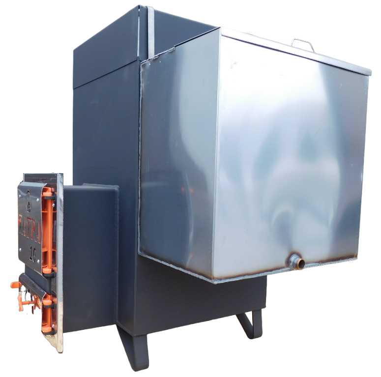 Печь для бани комплектуется навесным баком на 80 литров (335x500x500 мм), крепится сбоку печи. Можно комплектовать двумя баками, что увеличит объем воды до 160 литров.