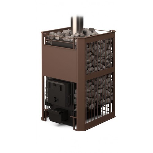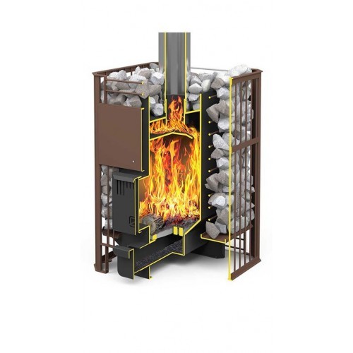 Печь для бани Теплодар Бугринка 16 ТУ придётся по нраву настоящим ценителям русской бани, ведь в формировании микроклимата участвует большая масса заложенных в печь камней. Камни в сетке прогреваются от топки и передают много «мягкого» тепла в парилку, нагревая её до умеренных температур. Быстрый прогрев стал возможен благодаря внутреннему сетчатому конвектору, который оставляет проход для горячего воздуха вдоль боковых стенок топки и при этом обеспечивает нагрев камней от инфракрасного излучения топки. Сетчатый конвектор, образующий с топкой конвекционный канал, полностью исключает локальный перегрев металла боковых стенок топки из-за соприкосновения с камнями, что в отличие от печей других производителей значительно продлевает ресурс печи.
