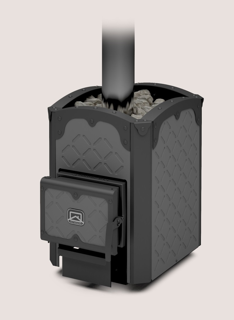 Еще одной отличительной особенностью печи, без сомнений, стала максимально возможная площадь теплообмена за счет большого количества конвекционных ребер чугунной топки. Да и округлая форма самой топки сконструирована так, чтобы прогревать весь объем каменной закладки без застойных «холодных» зон. В результате имеем максимально жесткую и действительно прочную печь. Нагревайте парную быстро, парьтесь по-богатырски! Выверенная конструкция печи позволяет равномерно прогреть не только парную, но и мойку, и комнату отдыха. Печь «Былина» рассчитана на парную объемом до 12 м3. Диаметр дымохода 115 мм. На печь можно установить любые стандартные элементы дымохода.