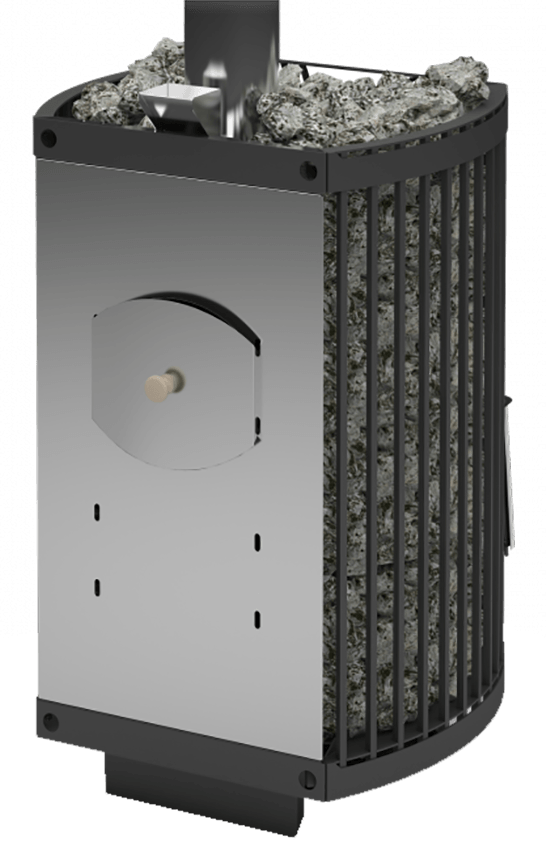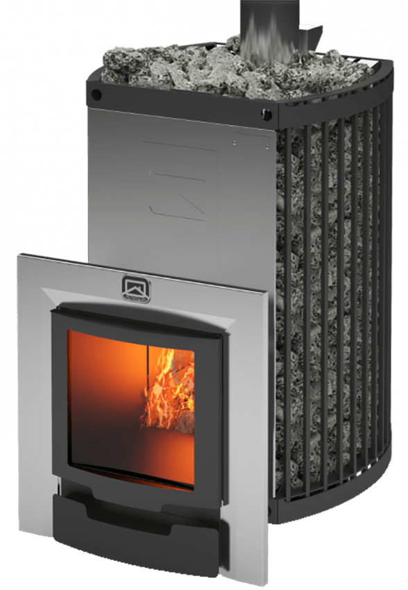 Для облегчения доступа к камням закрытой каменки предусмотрена расположенная над топкой заливная воронка с дозатором и распылителем. Вода залитая в воронку равномерно распространяется по всему объему каменки. Дверца с большим панорамным стеклом позволяет организовать камин в комнате отдыха.
