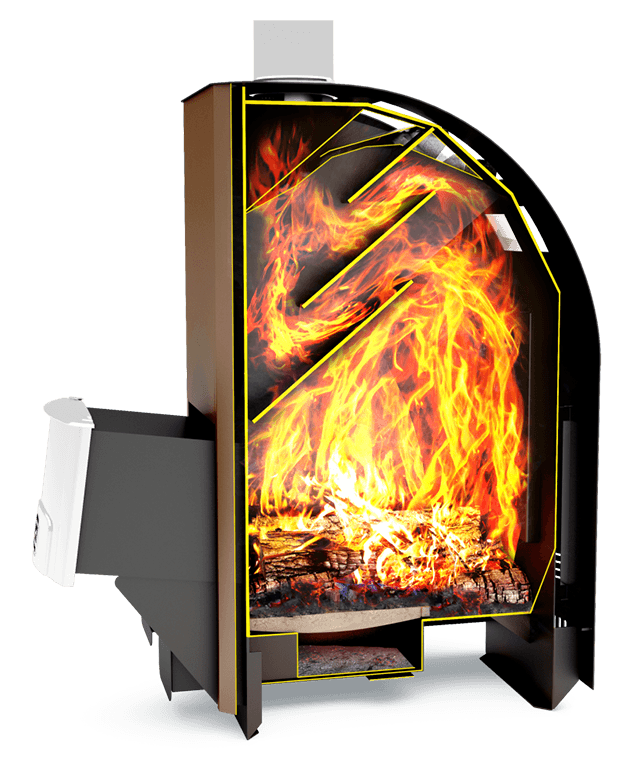 А для удобства подачи воды в глубь каменки, на более горячие камни, предусмотрен специальный лоток. Смотровое окно с термостойким стеклом позволяет наблюдать за огнем сидя прямо на полке парилки. В дополнение ко всему печь обладает многоходовой системой дымоудаления, что повышает КПД печи.