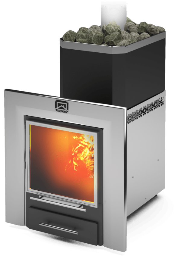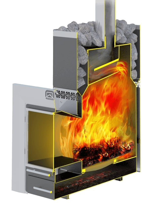 Печь оснащена встроенным парообразователем для получения пара с раскаленных пластин приваренных к боковым поверхностям топки печи, которые разогреваются до рекордных температур. Также печь оснащена большим ПАНОРАМНЫМ стеклом для наблюдения за живым огнем из комнаты отдыха. Вентилируемая каменка и невысокий кожух-конвектор не сушат воздух в парилке, обеспечивая достаточную влажность приближенную к "Русской бане". Печь выдает легких влажный пар, микроклимат с умеренной температурой и повышенной влажностью. Нагрев воды возможен установкой на печь бака на трубе или теплообменника к которому подсоединяется выносной бак. Если нагрев воды не нужен используйте сэндвич-сетку в качестве первого элемента дымохода.